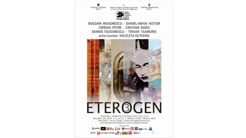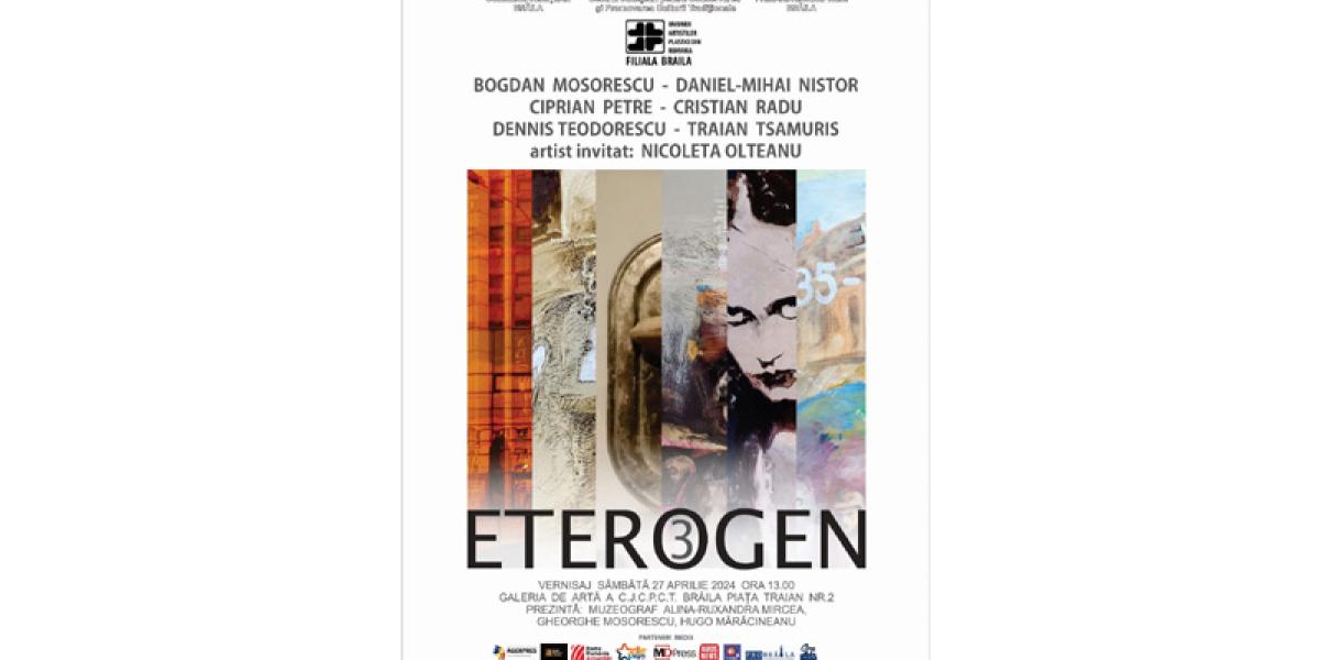 Consiliul Judeţean Brăila prin Centrul Judeţean pentru Conservarea şi Promovarea Culturii Tradiţionale (Centrul de Creație Brăila), Primăria Municipiului și Uniunea Artiștilor Plastici din România (UAPR) - Filiala Brăila organizează sâmbătă, 27 aprilie 2024, ora 13.00, la Galeria de Artă din Piața Traian nr. 2, vernisajul expoziției cu numărul 3 „Eterogen” - „o întâlnire a artei fotografice cu grafica, ceramica și pictura, domenii artistice ce au surprins diferite stilistici și stări”, o invitație de a lua parte la un univers autentic imaginat și colorat de artiștii expozanți.