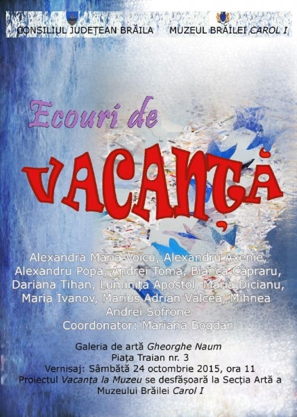 Galeria „Gheorghe Naum" a Muzeului Brăilei „Carol I", din Piaţa Traian, nr. 3, găzduieşte, sâmbătă, 24 octombrie, începând cu ora 11.00, vernisajul expoziţiei „Ecouri de vacanţă".