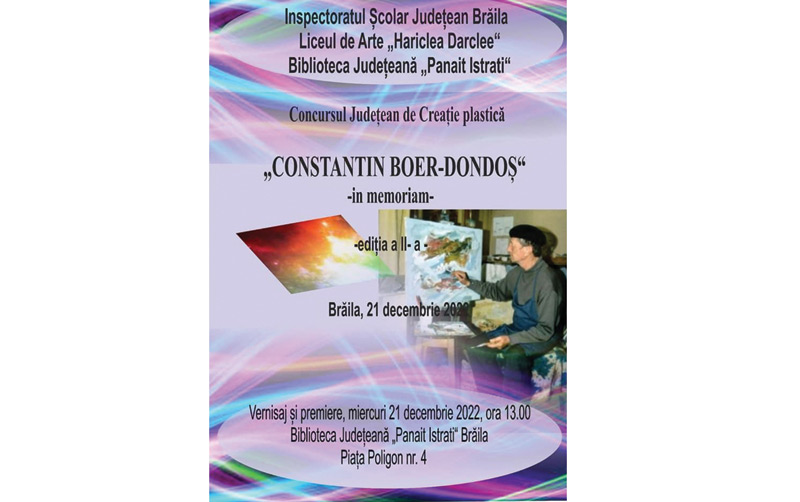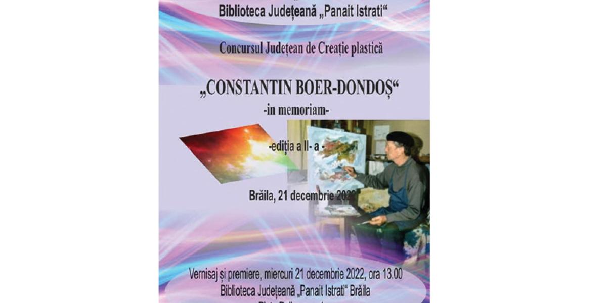 Biblioteca Județeană “Panait Istrati” vă invită miercuri, 21 decembrie, ora 13.00, la Centrul Multicultural "Dunărea" din cadrul Bibliotecii Județene “Panait Istrati” Brăila, unde va avea loc premierea câștigătorilor Concursului Județean de creație plastică "Constantin Boer Dondoș“ - in memoriam și vernisajul expoziției care conține lucrările realizate de participanții la concurs.