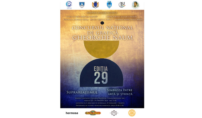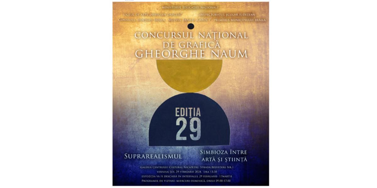 Muzeul Brăilei „Carol I” și Liceul de Arte „Hariclea Darclée” Brăila îi invită pe iubitorii de artă și de frumos de toate vârstele la deschiderea expoziției Concursului Național de Grafică „Gheorghe Naum” - Ediția a XXIX-a. Vernisajul și festivitatea de premiere vor avea loc joi, 29 februarie, începând cu ora 13.30, la Galeria Centrului Cultural Nicăpetre - Casa Embericos (Str. Belvedere nr. 1).