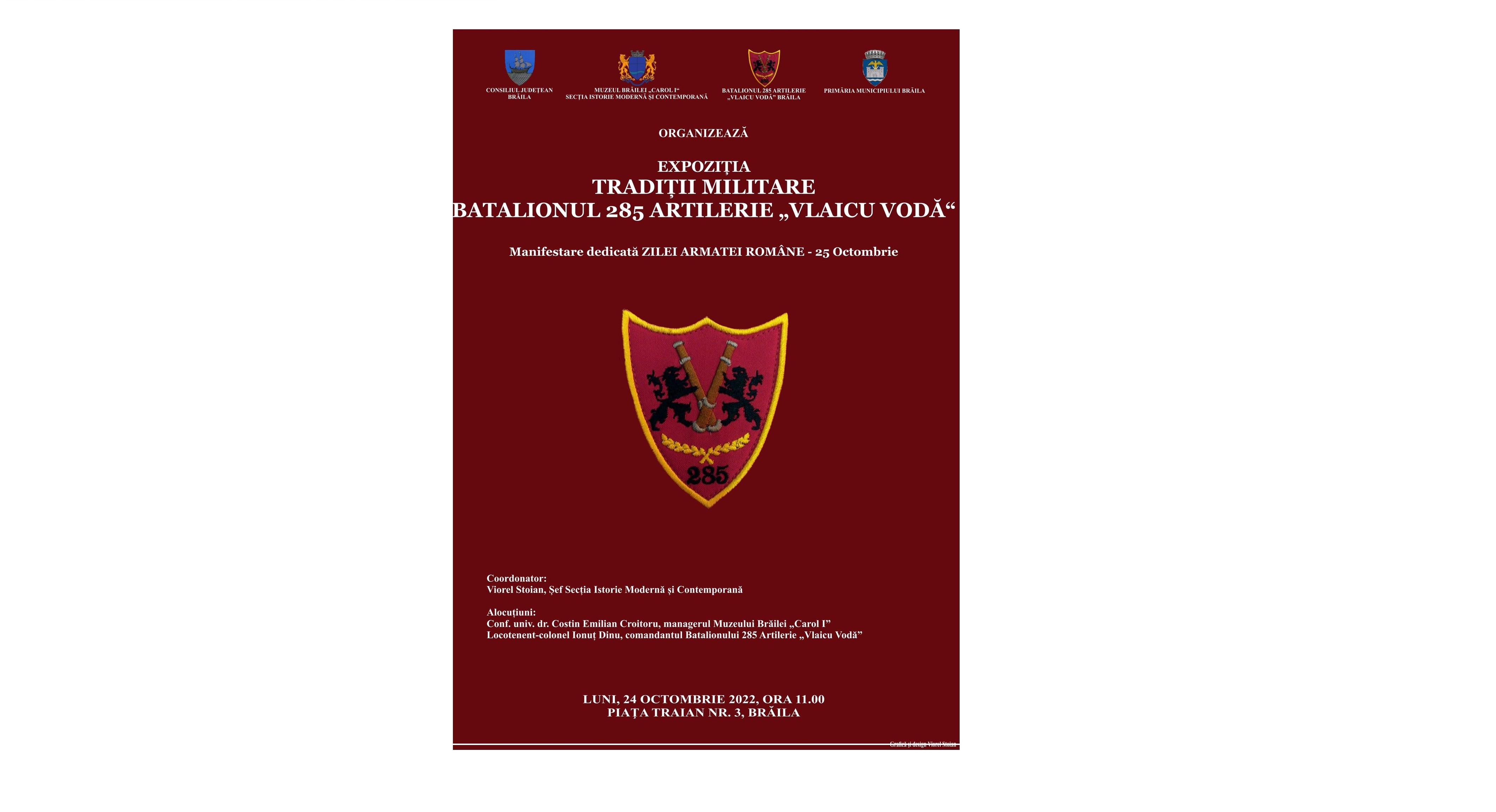 Muzeul Brăilei „Carol I”, în colaborare cu Batalionul 285 Artilerie „Vlaicu Vodă” Brăila organizează în ziua de luni, 24 octombrie 2022, începând cu ora 11.00, la sediul instituției din Piața Traian nr. 3, vernisajul expoziției Tradiții militare - Batalionul 285 Artilerie „Vlaicu Vodă” Brăila. Manifestarea este dedicată Zilei Armatei Române, care se sărbătorește, an de an, la data de 25 octombrie.