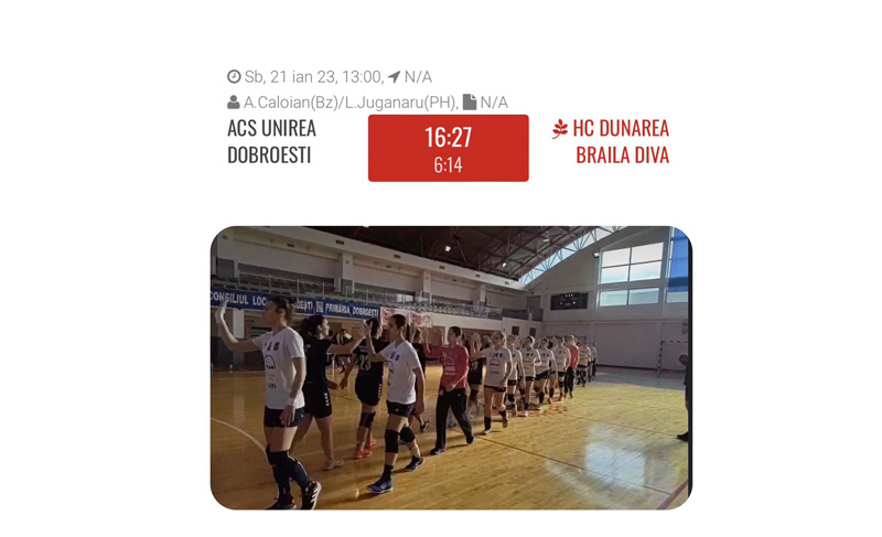 Partida de la Dobroești nu a avut istoric. Formația brăileană a controlat jocul în prima repriză și la pauză a avut un avantaj de 8 goluri, 14-6. Epureanu a înscris primul gol pentru echipa oaspete în repriza a doua, una în care, grație reușitei Teodorei Ababei, HC Dunărea II a avut și un avantaj de 14 goluri, 24-10.