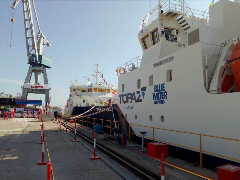 După speech-urile susţinute de directorul “VARD Brăila”, Alina Puia, şi de către Rene Kofod-Olsen, CEO al “Topaz Energy and Marine”, ambii subliniind faptul că pe parcursul comenzii nu au fost înregistrate accidente de muncă şi nici incidente de mediu, felicitându-i în acest sens pe navaliştii brăileni, a urmat momentul de vârf, adică “botezul” celor două nave. “Naşele”, Charaz Djouhri şi Susan Etchison, au avut mână bună şi, în uralele celor câteva sute de navalişti, au spart din prima sticla de şampanie, consfinţind astfel botezul lui “Topaz Neva” şi “Topaz Lena”. A urmat vizitarea celor două nave andocate la cheiul şantierului, după care oficialii au fost invitaţi la un dineu pe nava Mureş, de pe faleza Dunării.