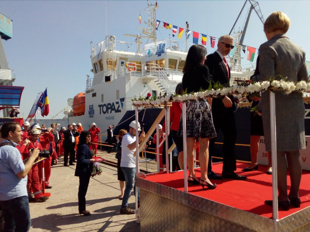 • compania a organizat, ieri, ceremonia de botez a două nave identice, complet echipate, primele dintr-o serie de 6 nave de transport module, parte a aceleiaşi comenzi, cu acelaşi armator, o premieră pentru şantierul naval brăilean • în prezenţa beneficiarilor şi invitaţilor acestora, cele două “naşe” au spart din prima şampania de prova celor două nave: Topaz Neva şi Topaz Lena • întreg evenimentul a fost organizat cu mare fast, invitaţilor fiindu-le oferit un spectacol susţinut de ansamblul folcloric “Pandelaşul” şi de Orchestra de suflători “Iosif Ivanovici”