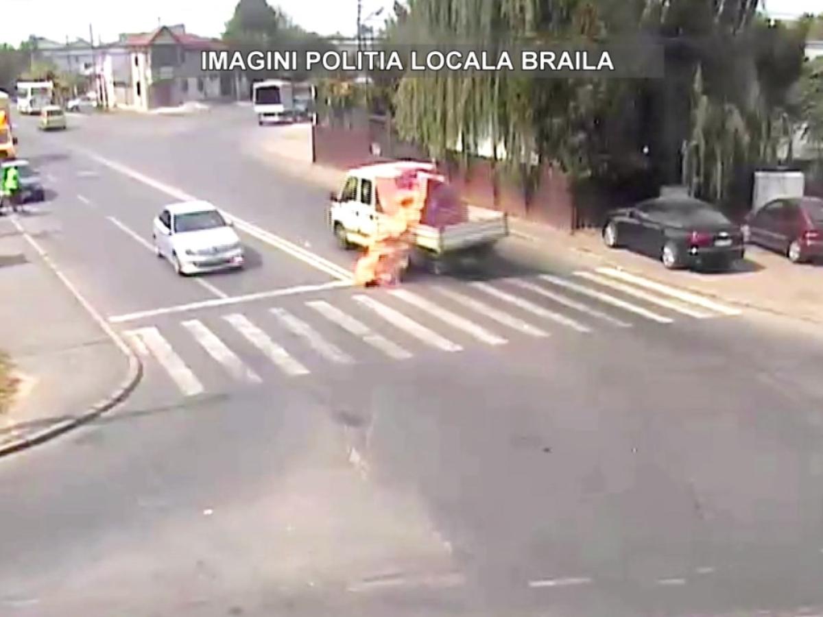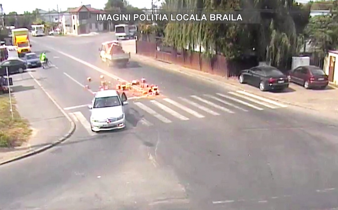 În filmarea video pusă la dispoziţie de Poliţia Locală Brăila se vede clar cum s-a produs întregul eveniment. Şoferul şi-a adunat rapid cărămizile de pe şosea, astfel că traficul rutier s-a deblocat la scurt timp de la producerea incidentului.