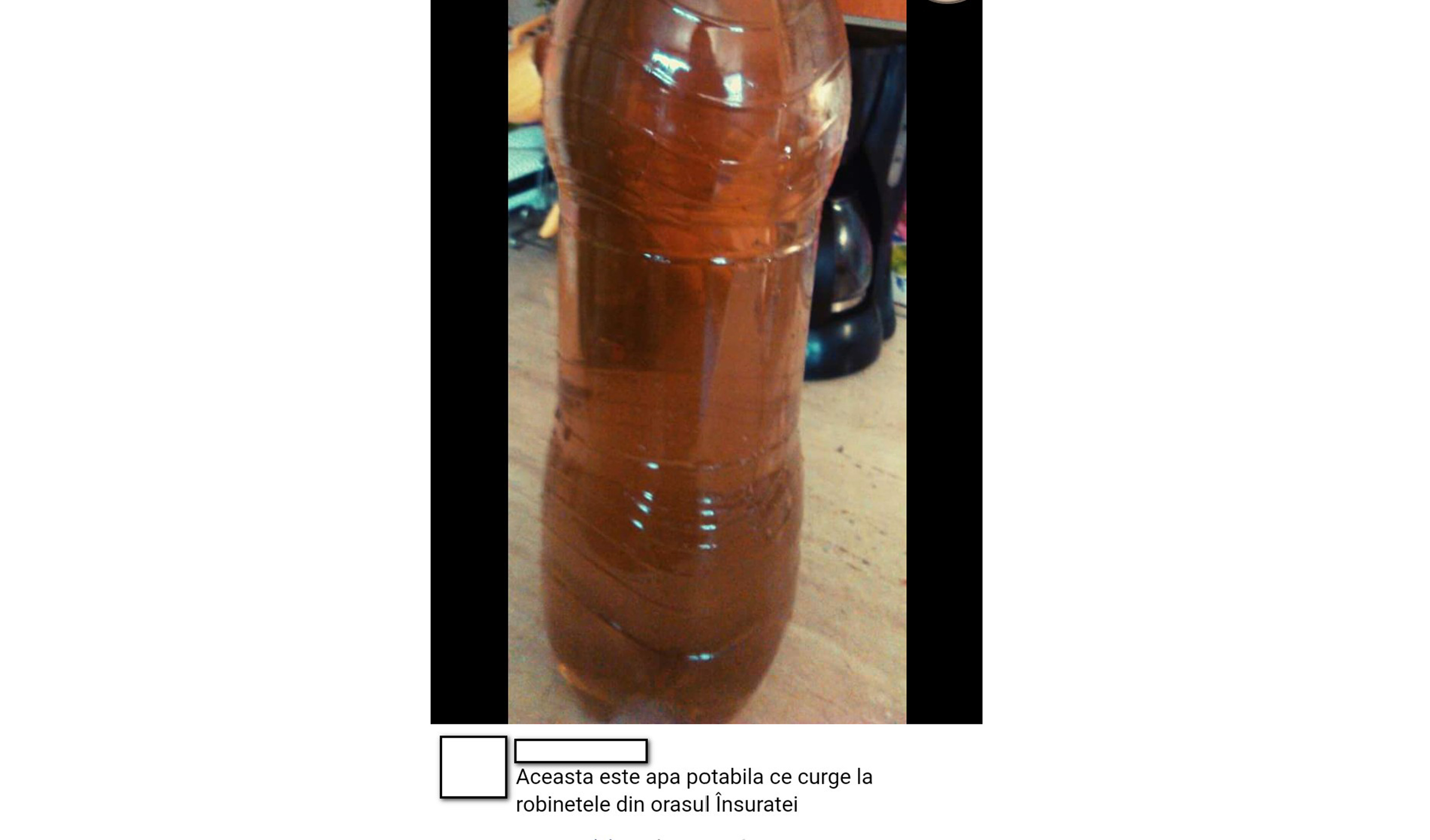 • mai mulţi cititori ne-au trimis poze şi filmări prin care vor să demonstreze că au existat episoade în care prin reţeaua publică s-a furnizat populaţiei din localitate apă care numai potabilă nu părea: avea culoare brun-roşiatică, sau brun-cenuşie