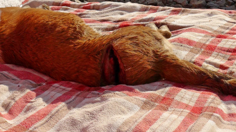 Starea animalului este critică, aspect confirmat şi de medicul Rudi Hofman, de la asociaţia „Dog Rescue”. „Are secţionată coloana şi măduva, o să-l trimitem astăzi la Bucureşti o să i se facă radiografie, investigaţii şi cel mai probabil o să existe o intervenţie chirurgicală zilele următoare, acum este pe antibiotic intravenos, Riscul cel mai mare ar fi al infecţiei. Cel mai probabil va rămâne un căţel paralizat, deci o să comandăm un căruţ. O să mai fie o problema socializarea câinelui, pentru că un câine care trece printr-o situaţie de genul asta e foarte greu să prindă încrederea oamenilor, manipularea lui va fi greoaie o perioadă”, ne-a spus Hofman.
