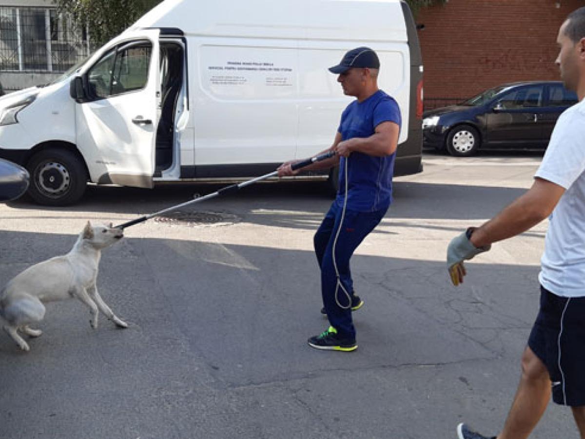 Poliţiştii i-au calmat pe oamenii ce erau revoltaţi de ceea ce păţise patrupedul şi i-a pregătit psihologic, dacă putem spune aşa, pentru ceea ce urmau să vadă, anume intervenţia echipei de ecarisaj. După circa 30 de minute, în zonă şi-a făcut apariţia o dubă albă a Serviciului de Utilitate Publică de Administrare şi Gospodărire Locală (SUPAGL), iar doi angajaţi şi-au intrat în rol: unul cu mănuşile, altul cu laţul. După ce au reuşit să prindă câinele, l-au tras spre dubă, iar la un moment dat unul dintre ei l-a apucat de coadă pentru a-l băga mai repede în cuşcă, deoarece oamenii începuseră să se revolte de metoda cu tentă barbară folosită, în general, de hingheri în astfel de situaţii. Patrupedul urma să ajungă la adăpostul din localitatea Unirea.
