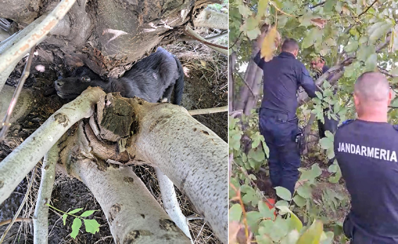 Un câine care a rămas blocat între crengile unui copac de pe un câmp din Ianca a fost ajutat de jandarmi. Animalul era speriat, mai ales că se chinuise ceva timp să scape.