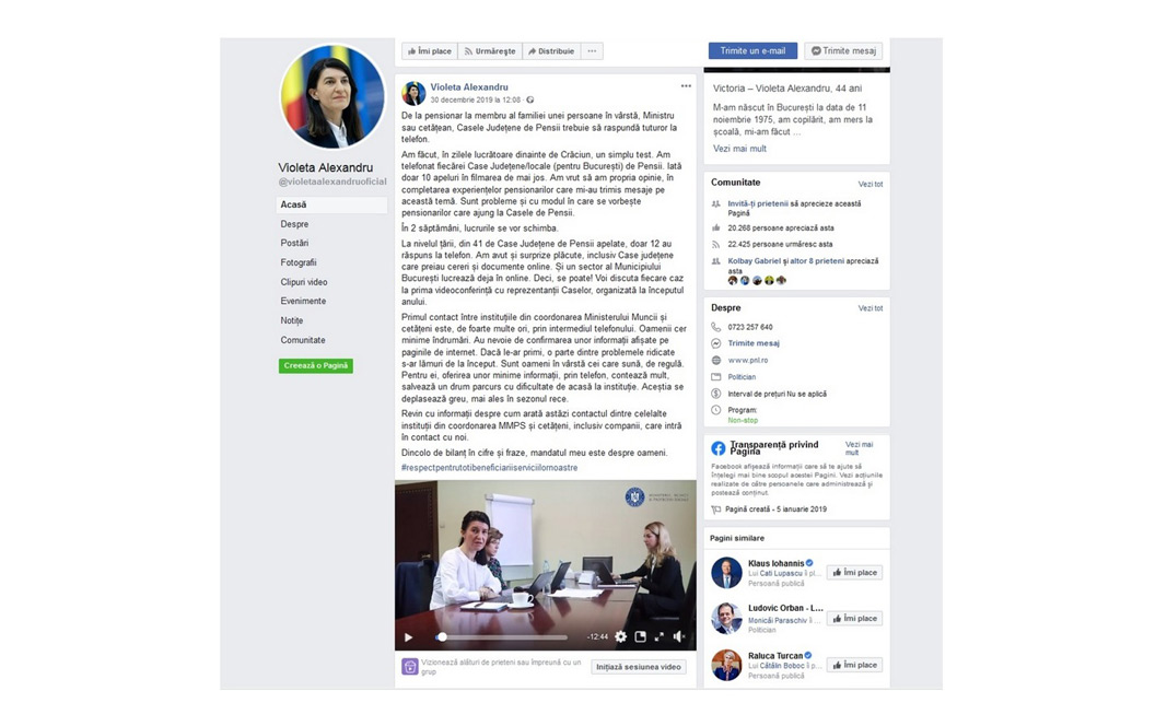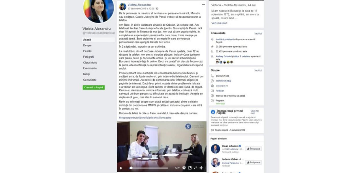 “De la pensionar la membru al familiei unei persoane în vârstă, Ministru sau cetăţean, Casele Judeţene de Pensii trebuie să răspundă tuturor la telefon. Am făcut, în zilele lucrătoare dinainte de Crăciun, un simplu test. Am telefonat fiecărei Case Judeţene/locale (pentru Bucureşti) de Pensii. Iată doar 10 apeluri în filmarea de mai jos. Am vrut să am propria opinie, în completarea experienţelor pensionarilor care mi-au trimis mesaje pe această temă. Sunt probleme şi cu modul în care se vorbeşte pensionarilor care ajung la Casele de Pensii. În 2 săptămâni, lucrurile se vor schimba. La nivelul ţării, din 41 de Case Judeţene de Pensii apelate, doar 12 au răspuns la telefon. Am avut şi surprize plăcute, inclusiv Case judeţene care preiau cereri şi documente online. Şi un sector al Municipiului Bucureşti lucrează deja în online. Deci, se poate! Voi discuta fiecare caz la prima videoconferinţă cu reprezentanţii Caselor, organizată la începutul anului”, a promis Violeta Alexandru.