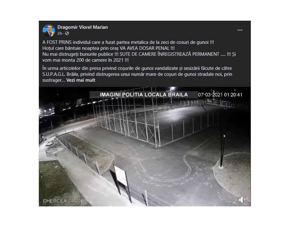 ”A FOST PRINS individul care a furat partea metalică de la zeci de coșuri de gunoi!!! Hoțul care bântuie noaptea prin oraș VA AVEA DOSAR PENAL!!! Nu mai distrugeți bunurile publice!!! SUTE DE CAMERE ÎNREGISTREAZĂ PERMANENT!!! Și vom mai monta 200 de camere în 2021!!! În urma articolelor din presă privind coșurile de gunoi vandalizate și sesizării făcute de către S.U.P.A.G.L. Brăila, privind distrugerea unui număr mare de coșuri de gunoi stradale noi, prin sustragerea componentelor metalice ale acestora, Poliția Locală Brăila a demarat acțiuni specifice de identificare a făptașului. Astfel, în urma verificărilor efectuate în sistemul de monitorizare video al municipiului, s-a constatat că o persoană de sex masculin a furat, în mai multe nopți, componentele metalice ale coșurilor de gunoi. Pe camerele de supraveghere din parcurile de joacă pentru copii din cartierele Hipodrom, Obor și Chercea se observă cum individul vine pe bicicletă noaptea, de multe ori chiar după ora până la care este permisă circulația în oraș, în contextul restricțiilor impuse de epidemia de COVID 19, scoate componentele metalice ale coșurilor de gunoi, le pune pe bicicletă și pleacă. În urma verificărilor efectuate la centrele de colectare a materialelor feroase din Municipiul Braila, persoana respectivă a fost înregistrată la unul dintre centre, în mai multe rânduri, predând materiale feroase similare celor sustrase din parcurile de joacă pentru copii”, precizează primarul în comunicatul publicat pe rețelele de socializare.