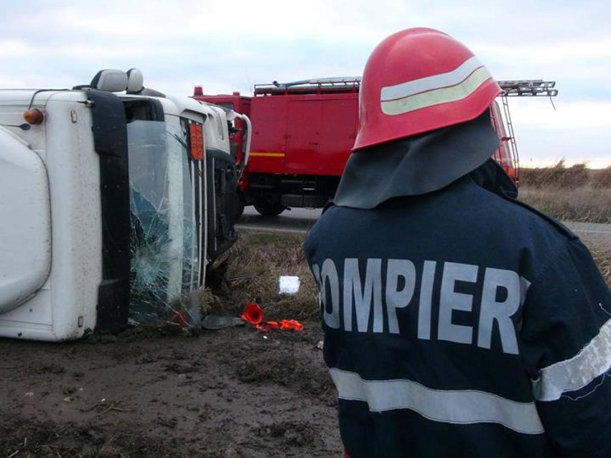 Acţiune dificilă în această seară pe DJ 212, la 2 km de localitatea Viziru. O cisternă încărcat cu 40 de tone de bitum la temperatura de 150 de grade s-a răsturnat. Şoferul de 43 de ani se deplasa de la Constanţa spre Galaţi şi, la un moment dat, o explozie la un pneu pe partea dreapta faţă l-a aruncat în şanţul de pe marginea şoselei. În urma evenimentului, soţia şoferului, în vârstă de 34 de ani, şi fiica de 13 au ajuns la spital, dar nu au rămas internate.