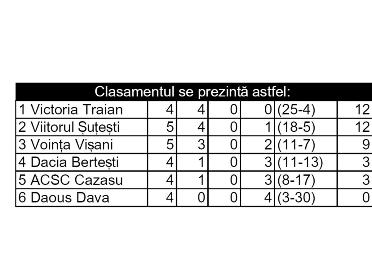 Scorul etapei a 6-a a fost stabilit de ACSC Cazasu care s-a impus cu 7-4, pe teren propriu, în partida cu ocupanta locului al patrulea, Dacia Bertești. Un meci controlat din primul și până în ultimul minut de echipa gazdă, care de exemplu, în minutul 58 conducea cu 7-2. Jucătorii acestei partide au fost Sorin Techiu și Goleanu care au marcat câte două goluri fiecare.