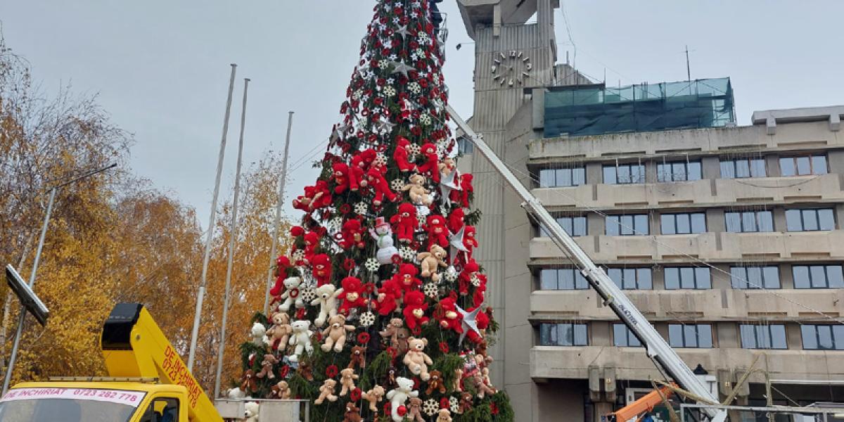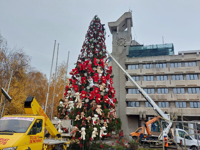 • ajutați de utilaje și macarale, angajații Primăriei au instalat, ieri, Pomul de Crăciun în Piața Independenței și l-au împodobit cu sute de ursuleți de pluș, cadouri și ghirlande • totodată, au toaletat copacii și arbuștii ornamentali din zonă și au pregătit cele 60 de căsuțe de lemn ale Târgului de Iarnă • la târg vor fi prezenți meșteri, creatori handmade și artizani din Brăila, din mai multe județe ale țării și din Moldova de peste Prut * pe 1 Decembrie, ”Plăieșii” vor cânta în Piața Independenței