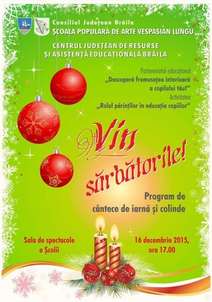 Şcoala Populară de Arte "Vespasian Lungu" Brăila, în parteneriat cu Centrul Judeţean de Resurse şi Asistenţă Educaţională organizează pe 16 decembrie, începând cu orele 17.00, spectacolul de cântece de iarnă şi colinde "Vin sărbătorile". Evenimentul se înscrie în cadrul activităţii "Rolul părinţilor în educaţia copiilor" din parteneriatul educaţional "Descoperă frumuseţea interioară a copilului tău!" şi se va desfăşura în sala de spectacole a Şcolii Populare de Arte.