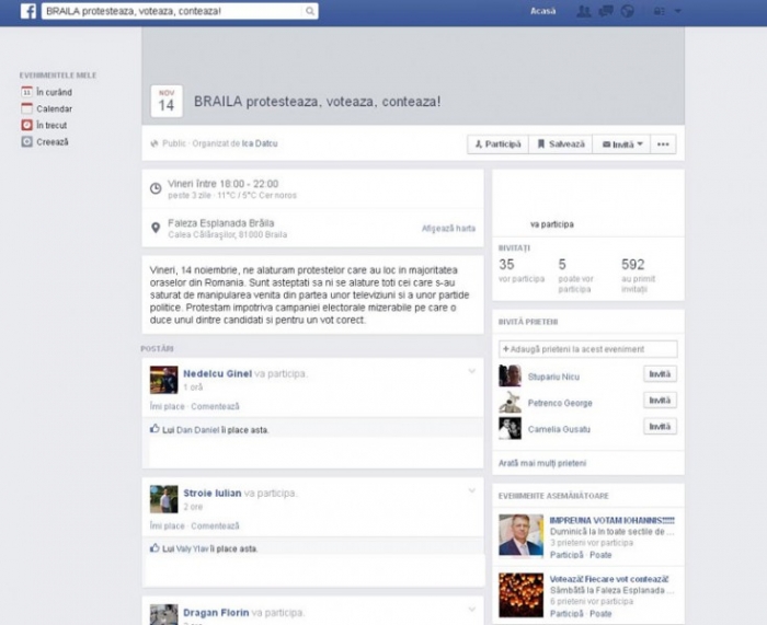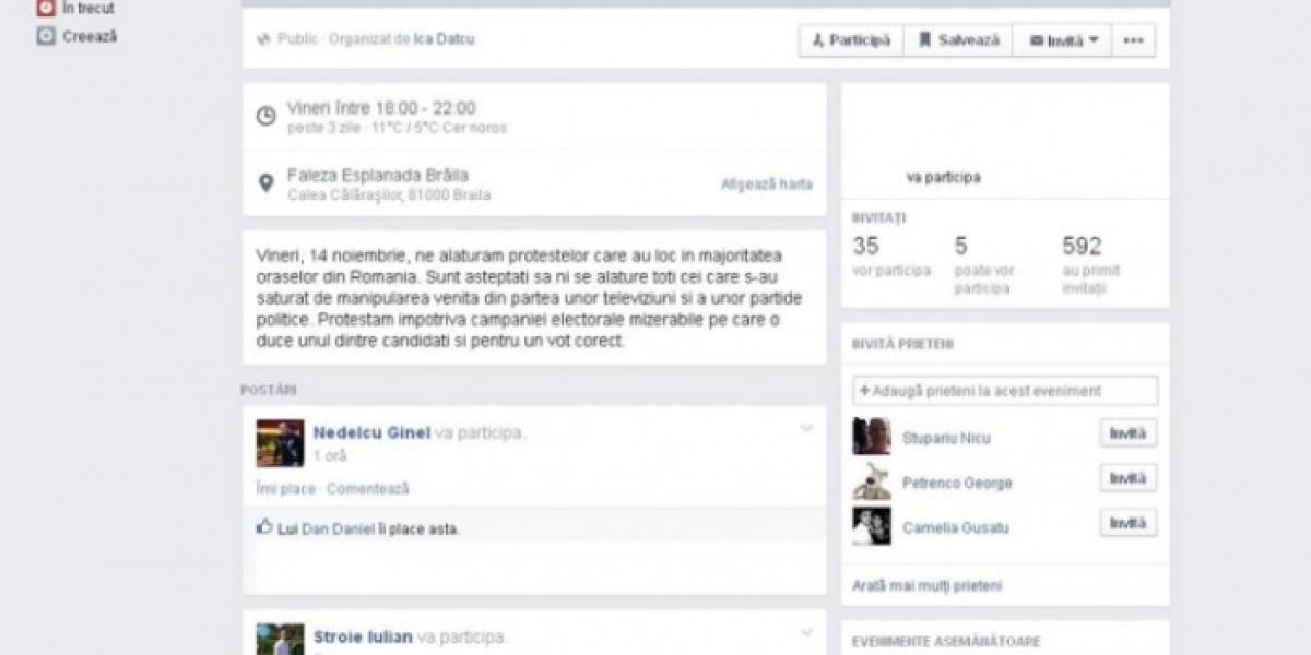 Nemulţumiţi de faptul că românilor din străinătate li s-a încălcat dreptul la vot, tinerii brăileni se organizează pe Facebook pentru o mişcare de protest. Evenimentul este programat pentru vineri, de la ora 18.00, pe Esplanadă. În prezentarea de pe reţeaua de socializare, organizatorii condamnă manipularea practicată de unele televiziuni, campania electorală murdară şi cer un vot corect. "Sunt aşteptaţi să ni se alăture toţi cei care s-au săturat de manipularea venită din partea unor televiziuni şi a unor partide politice. Protestăm împotriva campaniei electorale mizerabile pe care o duce unul dintre candidaţi şi pentru un vot corect", se arată pe pagina de Facebook.