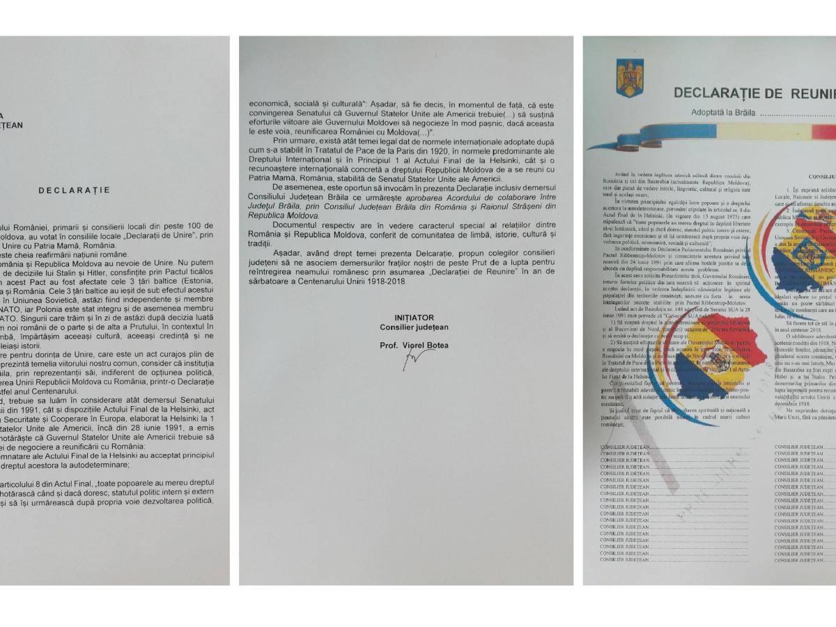 “În mod egal, şi România şi Republica Modova au nevoie de Unire. (...) În semn de preţuire pentru dorinţa de Unire, care este un act curajos plin de încărcătură istorică, ce reprezintă temelia viitorului nostru comun, consider că instituţia Consiliului Judeţean Brăila, prin reprezentanţii săi, indiferent de opţiunea politică, trebuie să declare susţinerea Unirii Republicii Moldova cu România, printr-o declaraţie de Reunire, celebrând astfel anul Centenarului. (...) De asemenea, este oportun să invocăm în prezenta Declaraţie, inclusiv demersul CJ Brăila ce urmăreşte aprobarea Acordului de colaborare între Judeţul Brăila, prin Consiliul Judeţean Brăila din România şi Raionul Străşeni din Republica Moldova”, se arată în declaraţia semnată de Botea.