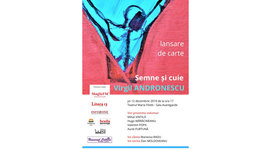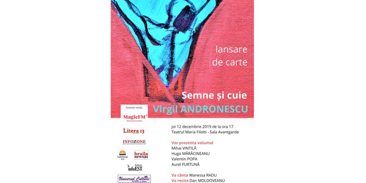 Joi, 12 decembrie 2019, ora 17.00, în sala Avantgarde a Teatrului “Maria Filotti” Brăila, Virgil Andronescu îşi lansează volumul de poezie “Semne şi cuie”.