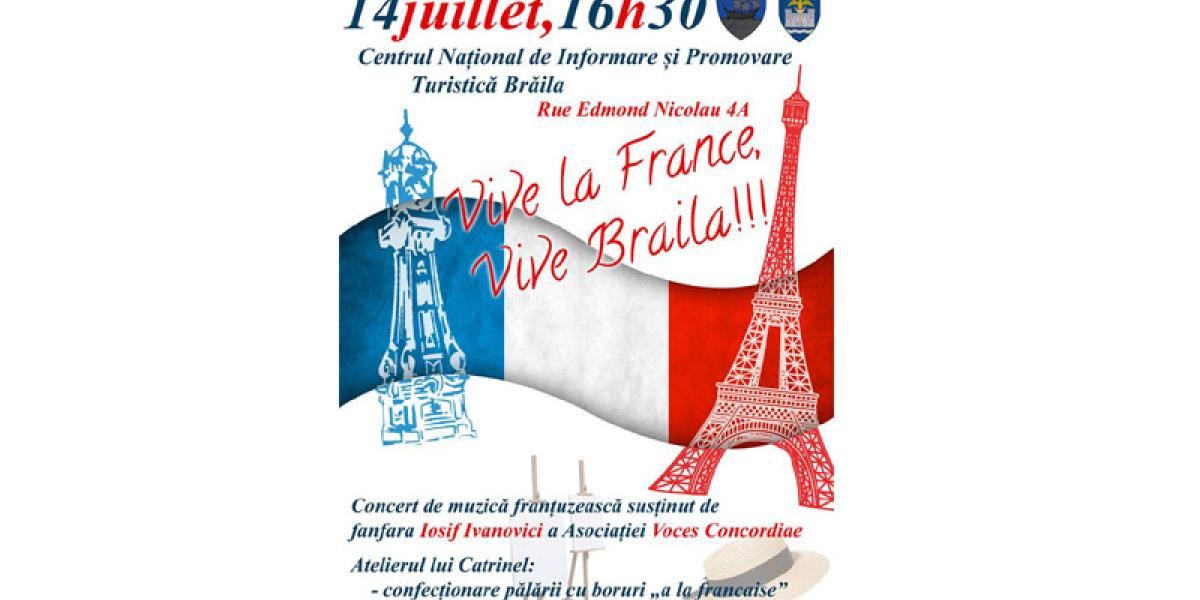 Vineri, 14 iulie 2017, de la ora 18.30, la Sediul Centrului Naţional de Informare şi Promovare Turistică Brăila va avea loc un concert de muzică franţuzească susţinut de fanfara Iosif Ivanovici a Asociaţiei Voces Concordiae. Evenimentul, intitulat generic Vive la France, Vive Brăila!!!, organizat de Primăria Municipiului Brăila cu ocazia Zilei Franţei, va continua cu Atelierul lui Catrinel, care constă în confecţionare de pălării cu boruri “a la francaise” şi picturi pe şevalet.