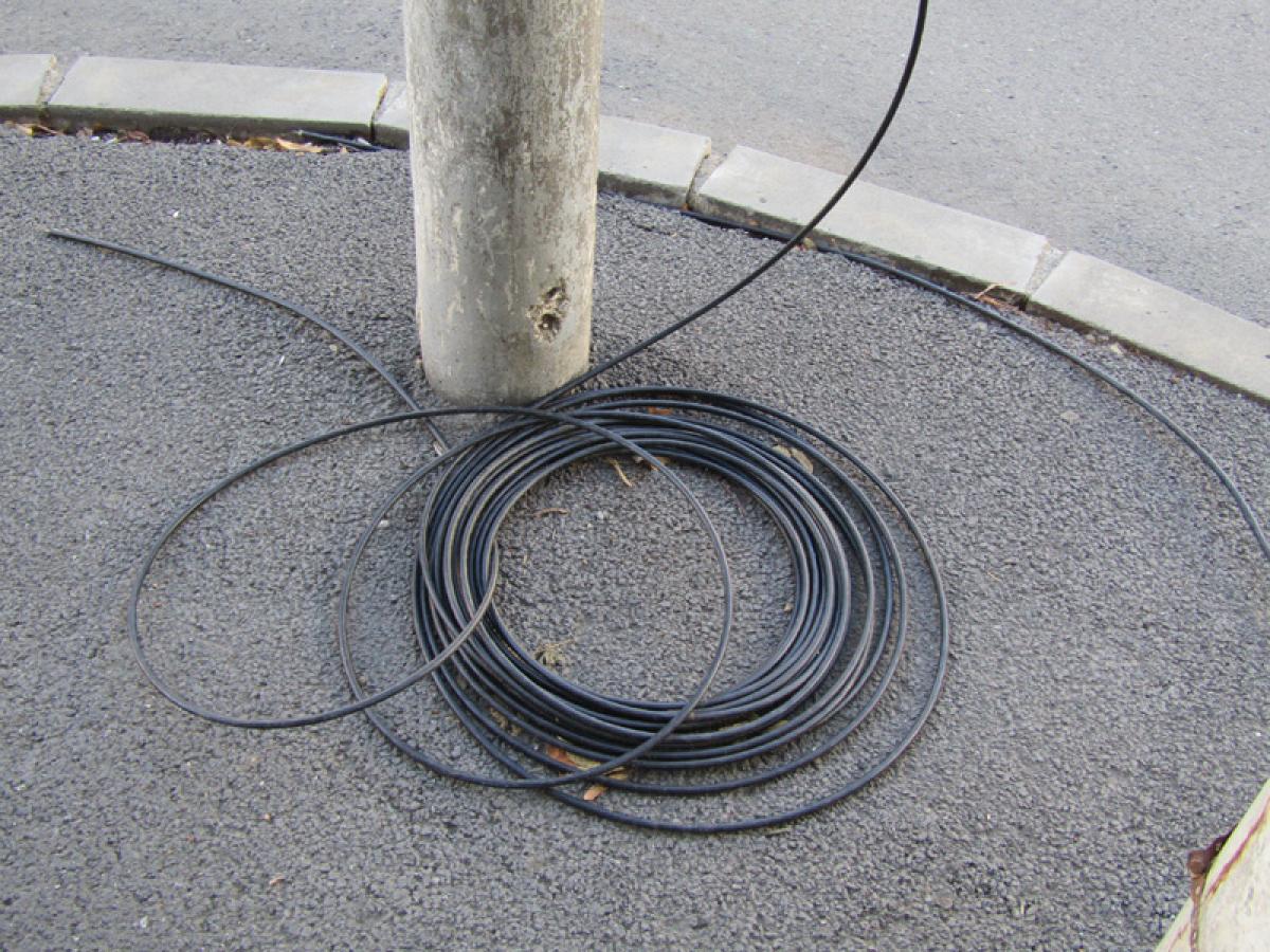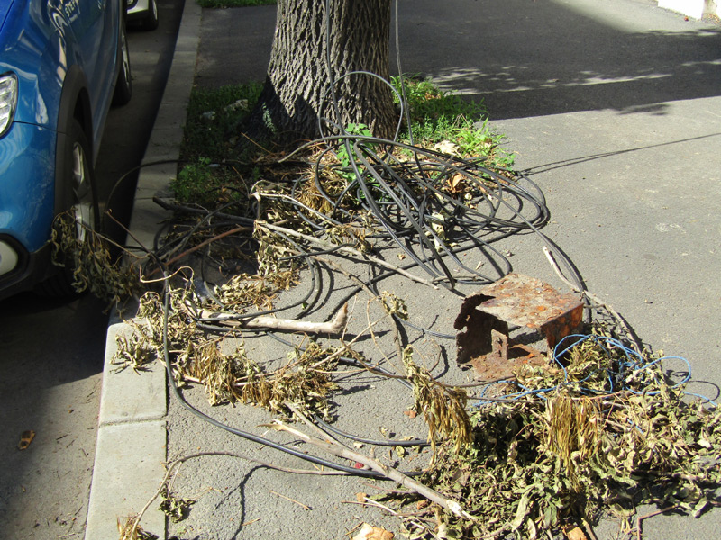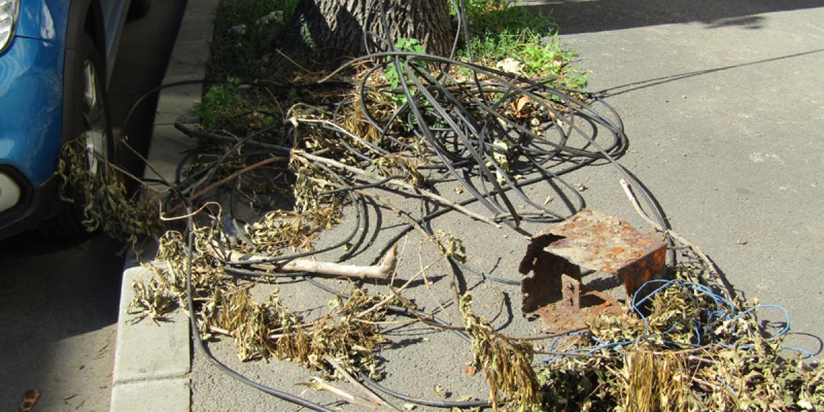 • la o săptămână de la ultima furtună, în zona fostului sediu al BCR, unde s-a mutat provizoriu Primăria Brăila, încă mai zac cabluri și crengi rupte de vânt • iar felul cum au fost fixați în pământ noii stâlpi de electricitate lasă, de asemenea, de dorit...