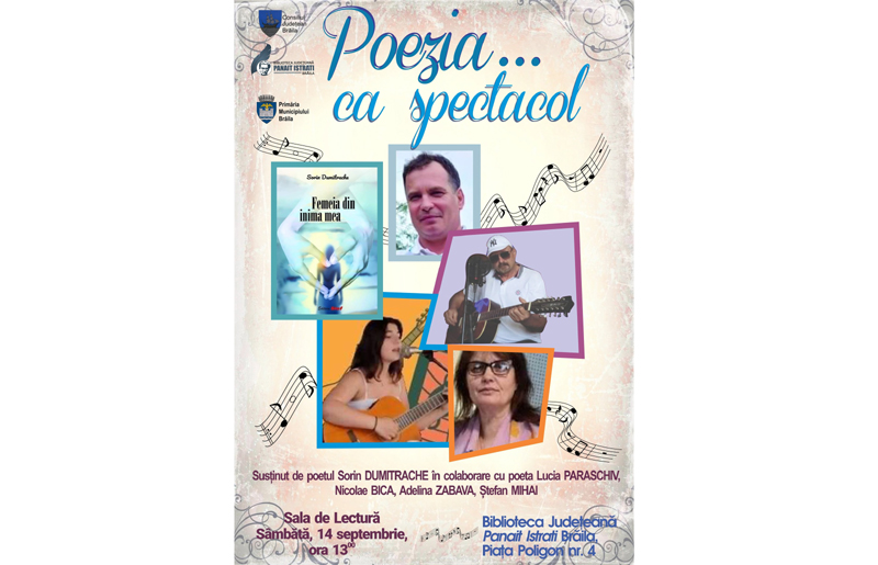 Brăilenii iubitori de muzică folk, poezie și bună dispoziție sunt invitați sâmbătă, 14 septembrie, începând cu ora 13.00, la evenimentul intitulat „Poezia... ca spectacol”, un program captivant cu muzică folk și poezie de bună calitate, susținut de Sorin Dumitrache și Lucia Paraschiv. Potrivit organizatorilor, cu acest prilej va avea loc lansarea volumului de versuri „Femeia din inima mea”, de Sorin Dumitrache.