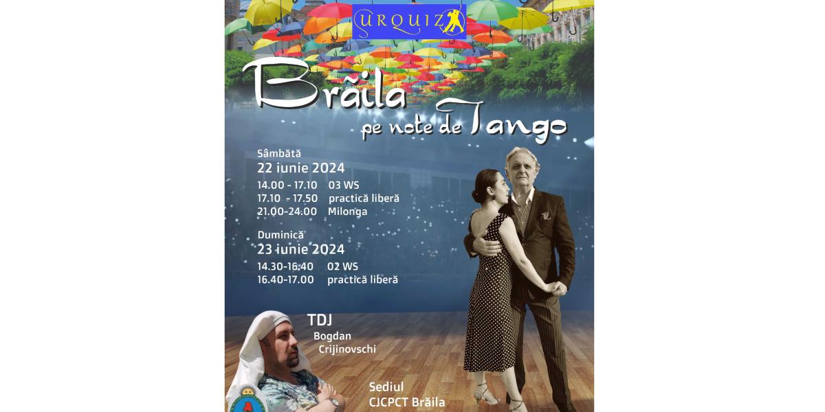 Brăila redevine capitala tangoului argentinian. Timp de două zile (22 și 23 iunie), peste 50 de pasionaţi ai dansului tango, profesionişti și amatori, îşi vor da întâlnire la sediul Centrului Județean pentru Conservarea și Promovarea Culturii Tradiționale Brăila (Centrul de Creație), fie în incinta Galeriei de Artă, din Piața Traian nr. 2, fie în Sala ProArte, locații deja consacrate ale tangoului autentic, pentru a lua parte la o experienţă deosebită, pentru a se perfecţiona în acest stil de dans, pentru a învăţa lucruri noi şi pentru a pătrunde în tainele tangoului.
