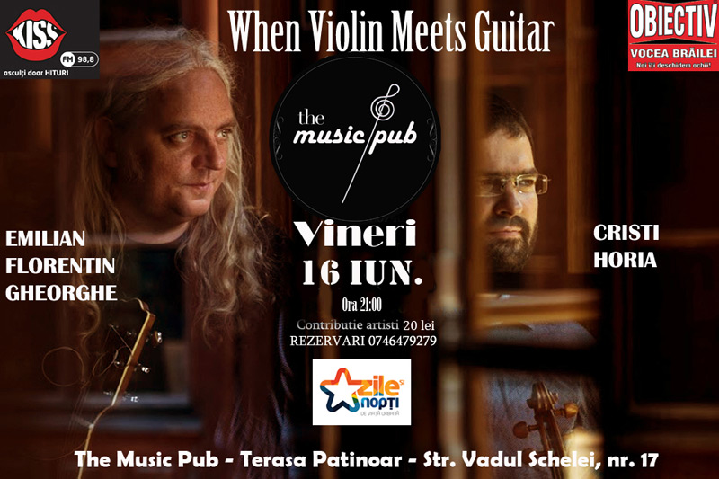 Un spectacol muzical inedit va avea loc vineri seară, la Brăila. Unul dintre membrii trupei binecunoscutului artist Mihai Mărgineanu - violonistul Cristi Horia, va ajunge în oraşul nostru, alături de colegul său, chitaristul Emilian Florentin Gheorghe. Cei doi formează grupul „When Violin Meets Guitar” şi vor susţine un concert în premieră la Brăila, vineri, 16 iunie, de la ora 21:00, pe terasa The Music Pub (de lângă Patinoar).