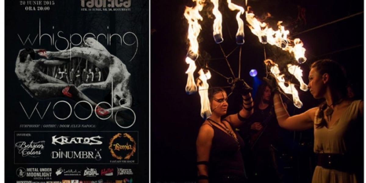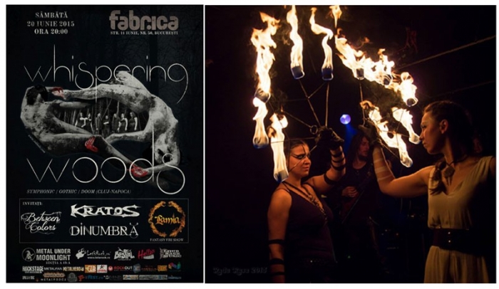 Spectacol complet la concertul Whispering Woods ce va avea loc, sâmbătă, 20 iunie, în clubul Fabrica (Str. 11 Iunie nr. 50, sector 4, Bucureşti). Formaţia clujeană de symphonic gothic doom metal Whispering Woods a pregătit un show special cu ocazia lansării celui de-al doilea CD din carieră, intitulat "Perditus Et Dea". Concertul din weekend va fi completat de Lamia Fantasy Fire Show - o trupă de dans cu foc, ce îşi propune să aducă pe meleagurile autohtone o mică parte din secretele şi misterele lumii - prin muzică, prin dansuri tribale, dar mai ales prin supunerea celui mai fascinant din cele patru elemente ale naturii: focul. "Motivul pentru care avem nevoie pe scenă de fetele de la Lamia este că ne completează conceptul descris de piese printr-o coregrafie teatrală şi pirotehnică", declară Doru Căilean (chitarist Whispering Woods), în cadrul unui comunicat de presă emis recent de organizatori. Afişul serii este întregit de trei formaţii de top în zona dark/gothic/doom metal: Kratos, DinUmbră şi Between Colors, toate cele trei trupe venind, la rândul lor, cu piese noi în recital. Accesul publicului la eveniment se va permite de la ora 20.00, iar preţul biletului este de 20 lei. Menţionăm că biletele se vor vinde la intrare, în seara concertului.