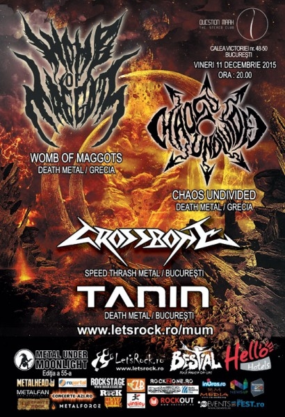 Alături de Womb of Maggots, în cadrul evenimentului Metal Under Moonlight 55 din Bucureşti, vor mai urca pe scenă grecii de la Chaos Undivided (death metal) şi două trupe bucureştene - Crossbone (speed thrash metal), Tanin (death metal). Cu doar un an de activitate în spate, Chaos Undivided rupe deja barierele groove death metalului. Trebuie subliniat că show-ul din capitală este primul pe care trupa îl susţine în afara Greciei. Crossbone este o trupă tânără, atât la propriu cât şi la figurat, dar care nu a trecut neobservată pe radarul niciunui thrasher local. De asemenea, Tanin este una dintre cele mai tinere trupe de melodic death metal din România. Pe 11 decembrie grupul va concerta live primul lor EP - "A New Journey", dar şi câteva piese noi, în premieră live.
