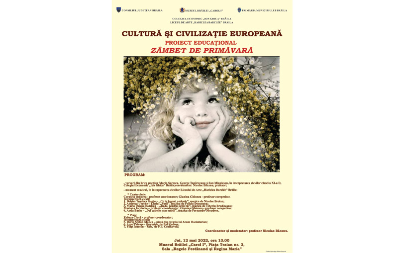 Muzeul Brăilei "Carol I" găzduiește joi, 12 mai 2022, ora 13.00, în Sala "Regele Ferdinand și Regina Maria" (Piața Traian nr. 3), o nouă etapă a proiectul educațional "Cultură și civilizație europeană" organizat de Colegiul Economic "Ion Ghica", în colaborare cu Liceul de Arte "Hariclea Darclee" și Muzeul Brăilei "Carol I".