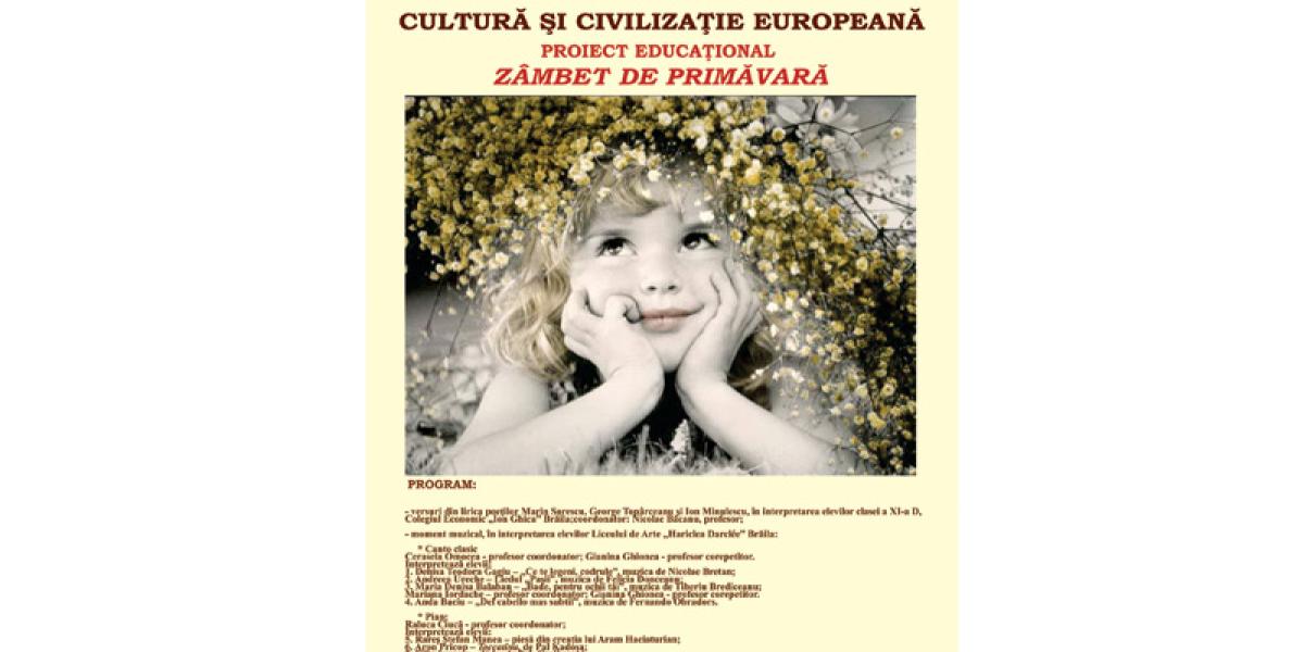 Tema manifestării este "Zâmbet de primăvară", iar programul va curprinde versuri din lirica poeților Marin Sorescu, George Topârceanu și Ion Minulescu, în interpretarea elevilor clasei a XI-a D, coordonați de Nicolae Băcanu, profesor la Colegiul Economic "Ion Ghica" Brăila. Va fi prezentat, de asemenea, un moment muzical în interpretarea elevilor Liceului de Arte "Hariclea Darclee" Brăila. Din program: canto clasic (Cerasela Oancea - profesor coordonator; Gianina Ghionea - profesor corepetitor) intrepretat de elevii Denisa Teodora Gagiu ("Ce te legeni, codrule", muzica, Nicolae Bretan); Andreea Ureche (Liedul "Pașii", muzica, Felicia Donceanu); Maria Denisa Balaban ("Bade, pentru ochii tăi", muzica, Tiberiu Brediceanu); Anda Baciu ("Del cabello mas subtil", muzica, Fernando Obradors).