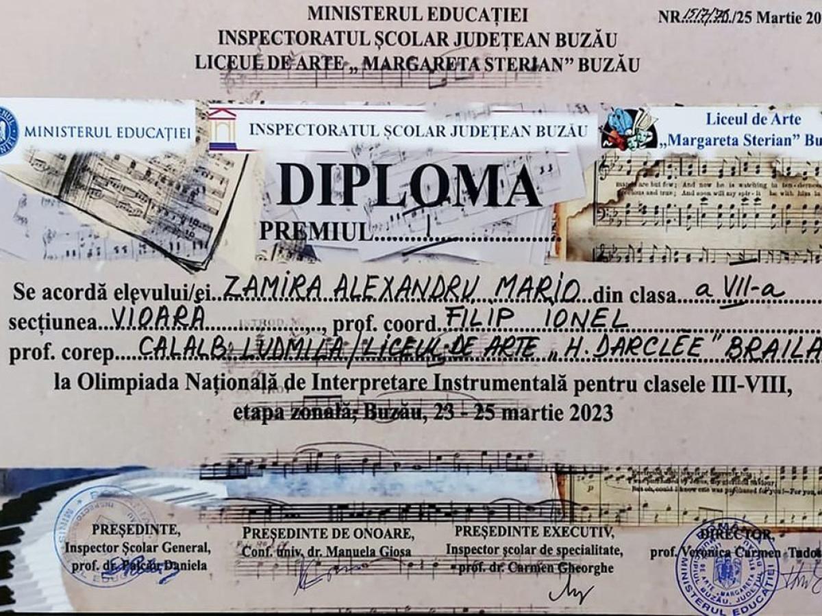 • elev în clasa a IX-a la Liceul de Arte „Hariclea Darclee”, Alexandru Zamira a primit în dar prima vioară la vârsta de 7 ani • exersează până la 8 ore pe zi și e atras, depotrivă, de Enescu, Mozart, Beethoven și Bach • fascinat de talentul lui Alexandru, profesorul Ionel Filip i-a oferit acestuia o vioară italiană, veche de două sute de ani, „o moștenire vie ce poartă în sine ecoul celor care au iubit-o din toată ființa”, după cum ne-a mărturisit elevul de la Arte • Alexandru are numai note de 9 și de 10, este primul din clasă și s-a calificat de patru ori la faza județeană a Olimpiadei de Interpretare Instrumentală și de două ori la faza națională