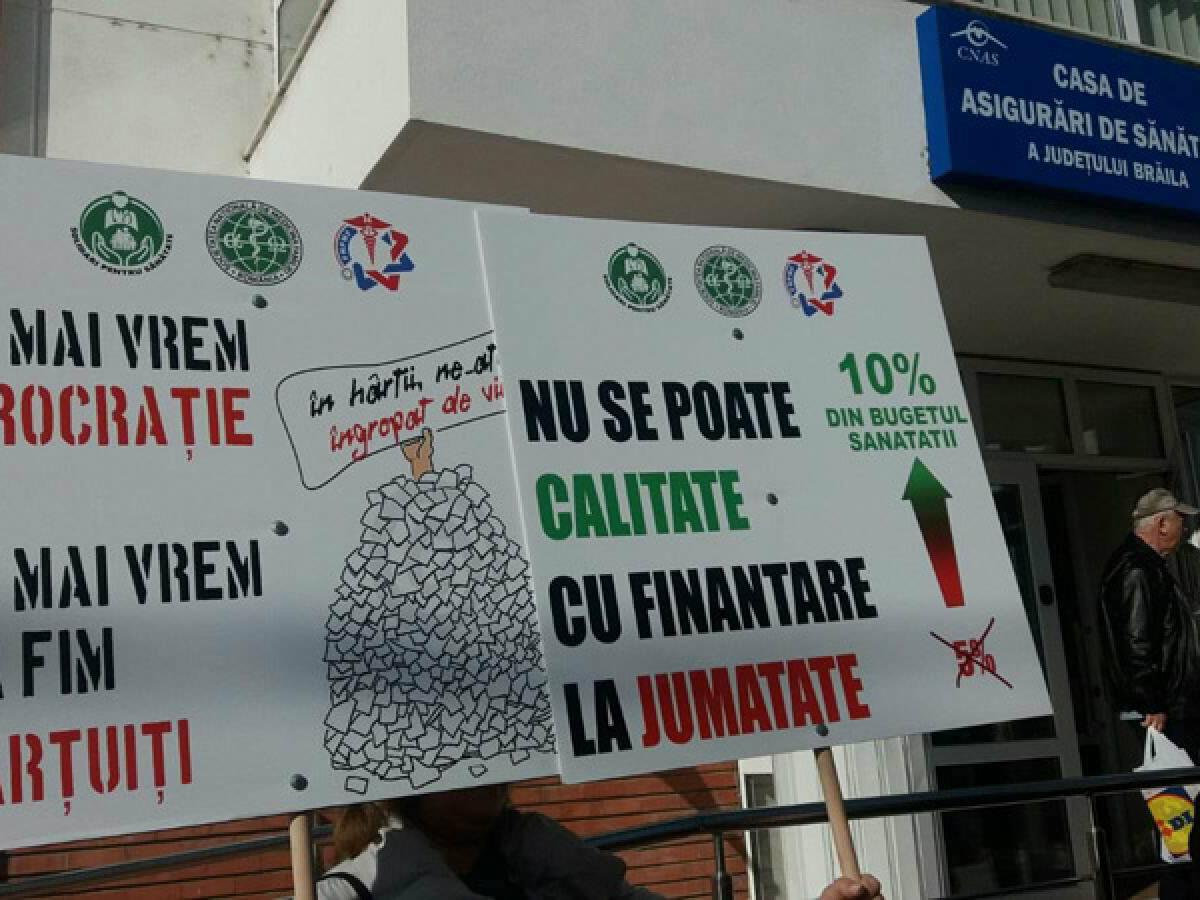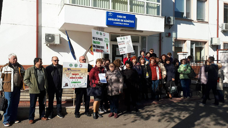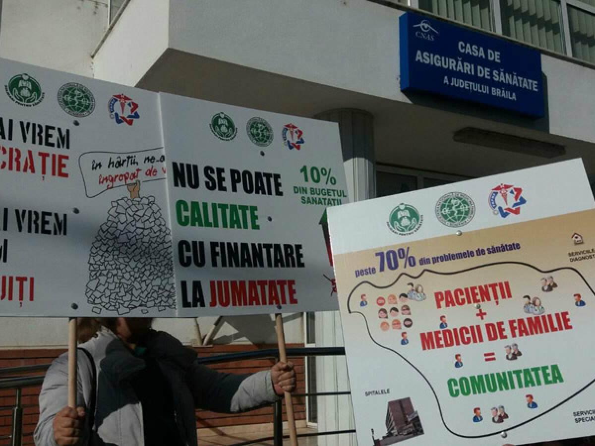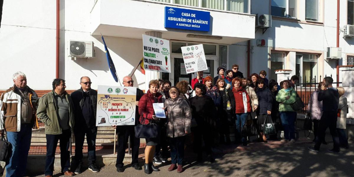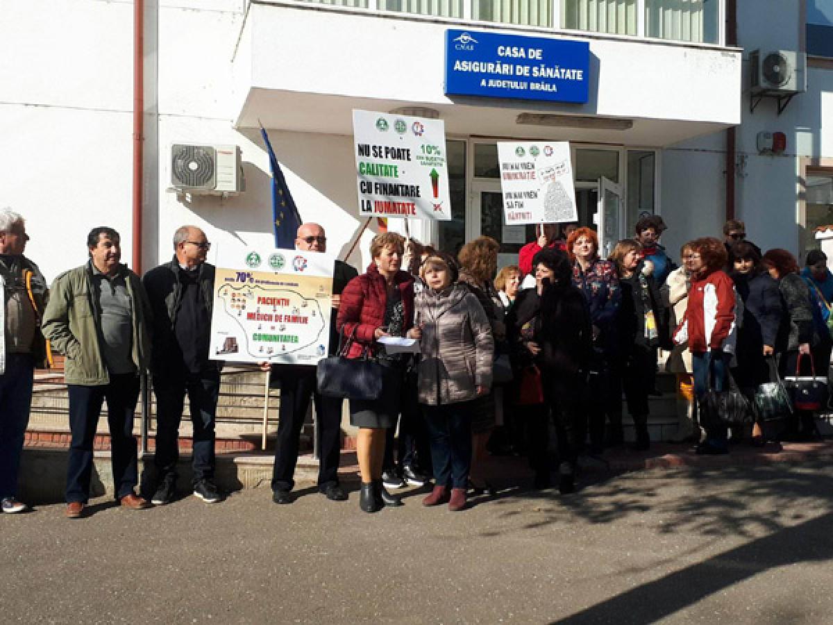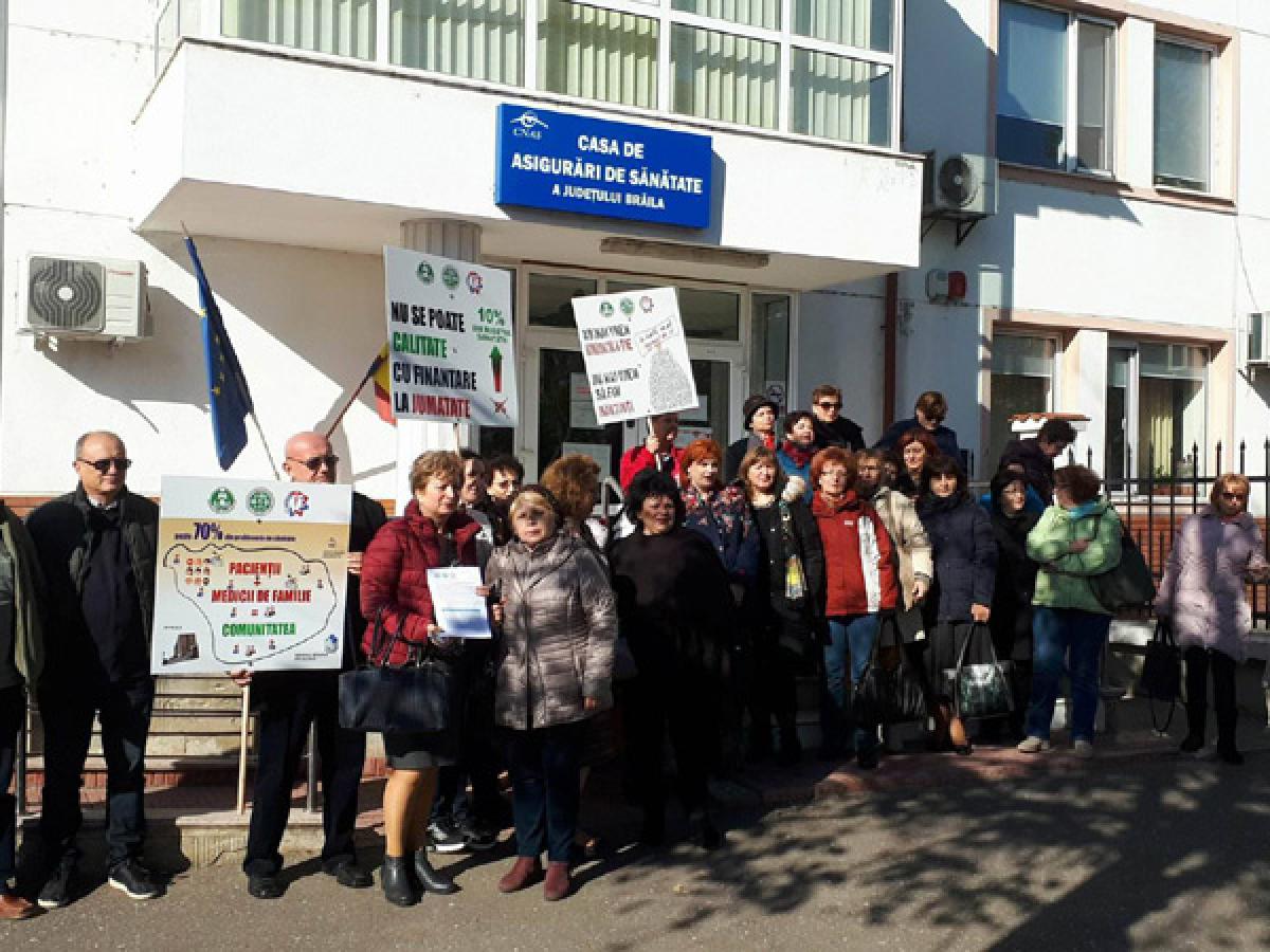 Aşa cum am precizat anterior, acţiunea de protest a avut loc, concomitent, în două locaţii din municipiu: la Prefectură şi la Casa Judeţeană de Asigurări de Sănătate. În faţa CJAS, s-au strâns 25 de medici de familie, asistente şi pacienţi, cu aceleaşi nemulţumiri şi speranţa că cineva îi va auzi.”Vrem să ne fie asigurate condiţii mai bune pentru desfăşurarea activităţii noastre de medicină de familie, atât pentru noi, cât şi pentru pacienţii noştri, pentru a le putea asigura nişte servicii de bună calitate. De asemenea, vrem o reaşezare a finanţării medicinei de familie care se pare că a fost uitată de către oficialităţi. Dorim un procent de cel puţin 10% din Fondul Naţional Unic de Asigurări de Sănătate, asemănător cu cele care sunt în celelalte sisteme europene, unde media este între 9 şi 15%. De asemenea, vrem respectarea indepedenţei profesionale. Legislaţia este foarte stufoasă, ne dorim debirocratizarea sistemului de sănătate. Avem alături de noi pacienţii, care ştiu că luptăm pentru ei. În anumite sate, medicul de familie este singura posibilitate de acces la serviciile medicale. Da, este deficit de medici de familie în judeţul Brăila. Medicina de familie nu mai este o opţiune pentru studenţi. În Brăila, mai mult de jumătate dintre medicii de familie au vârste de peste 50 ani. În Brăila, sunt 144 medici de familie care au cel puţin un asistent medical. Noi reuşim să ne luăm concedii de odihnă doar o săptămână sau două pe an! Preţurile la utilităţi au crescut, numai veniturile nu. Cum vom putea susţine funcţionarea cabinetelor în aceste condiţii?”, ne-a declarat dr. Marcela Vasilescu, vicepreşedinte SNMF, filiala Brăila. Aceasta a fost susţinută în declaraţii de către ceilalţi medici prezenţi.