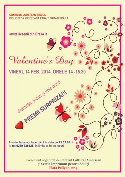 Liceenii pot petrece Valentines Day la Biblioteca Judeţeană "Panait Istrati", vineri, 14 februarie, între orele 14.00 şi 15.30.