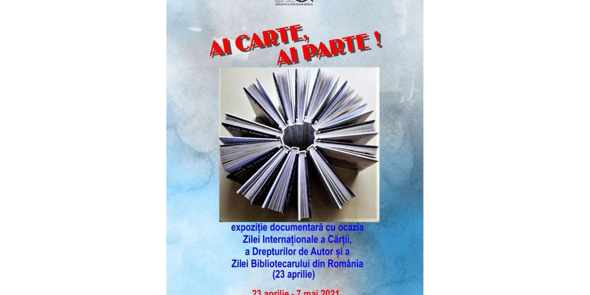 Biblioteca Județeană „Panait Istrati” Brăila a ales să sărbătorească ziua de 23 Aprilie, Ziua Mondială a Cărții și a Drepturilor de Autor, precum și Ziua Bibliotecarului din România, prin expoziția documentară „Ai carte, ai parte!”. Astfel, în perioada 23 aprilie - 7 mai, expoziția poate fi vizionată la parterul Secției Împrumut pentru Adulți din cadrul Bibliotecii.
