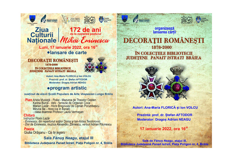 Programul zilei cuprinde Lansarea cărții ”Decorații românești în colecțiile Bibliotecii Județene ”Panait Istrati” Brăila: 1878-2000”, semnată de Ion Volcu, șef serviciu în cadrul BJPI Brăila, și Ana Maria Florică. Moderează: Dragoș Adrian Neagu, directorul Bibliotecii Județene ”Panait Istrati” Brăila. Prezintă: prof. dr. Ștefan Aftodor, președinte Filiala Brăila a Societății de Științe Istorice din România. Astfel, sunteți invitați să aflați mai multe despre tezaurul pe care îl deține biblioteca brăileană, nu mai puțin de 90 de decorații, medalii și ordine care reprezintă momente de referință din istoria României, începând cu perioada Războiului de Independență din 1877 până la sfârșitul secolului XX.