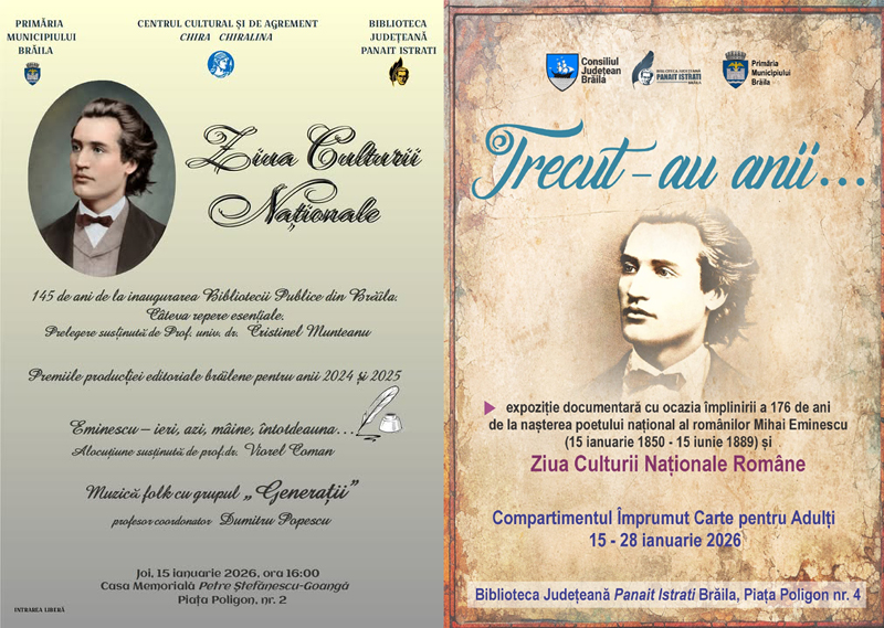 • joi, 15 ianuarie, la Casa Memorială „Petre Ștefănescu Goangă” va avea loc un important eveniment dedicat Zilei Culturii Naționale, organizat de Centrul Cultural și de Agrement „Chira Chiralina”, în parteneriat cu Biblioteca Județeană „Panait Istrati” • în aceeași zi, la sediul Bibliotecii Publice se va deschide expoziția documentară intitulată „Trecut-au anii…”