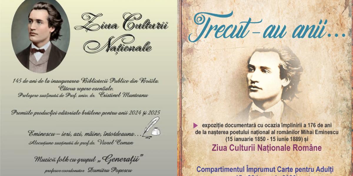 Ziua Culturii Naţionale este sărbătorită în fiecare an la 15 ianuarie, data aleasă fiind aceea a naşterii poetului Mihai Eminescu (1850-1889). Biblioteca Județeană „Panait Istrati” marchează acest eveniment prin organizarea unei expoziții documentare intitulată „Trecut-au anii…” aflată la parterul Compartimentului Împrumut Carte pentru Adulți.