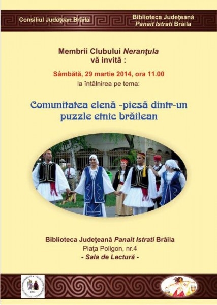 Sâmbătă, 29 martie, de la ora 11.00, la Biblioteca Judeţeană se va sărbători Ziua Naţională a Greciei, cu o manifestare intitulată "Comunitatea elenă: piesă dintr-un puzzle etnic brăilean". Cu această ocazie, Comunitatea Elenă din Brăila va prezenta un program cultural-artistic, în cadrul căruia grupul "Parnassos" va prezenta dansuri tradiţionale greceşti.