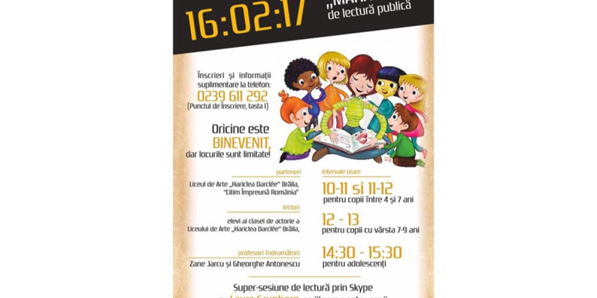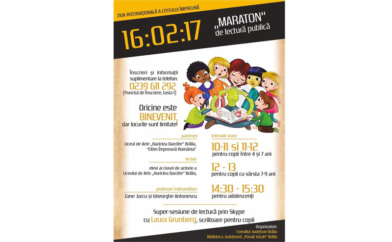 Joi, 16 februarie, Biblioteca Judeţeană “Panait Istrati” Brăila în parteneriat cu organizaţia “Citim Împreună România” şi Liceul de Arte “Haricleea Darcle” organizează un adevărat “maraton” de lectură. Evenimentul desfăşurat cu ocazia Zilei internaţionale a cititului împreună va fi găzduit de Biblioteca Judeţeană, iar sesiunile de lectură vor fi organizate pe categorii de vârstă astfel:
