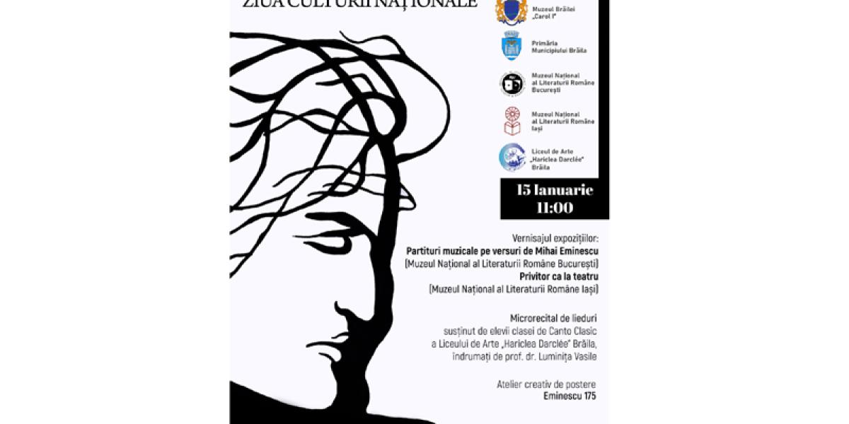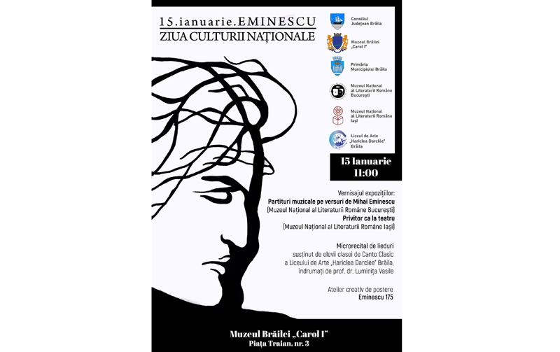 Muzeul Brăilei „Carol I”, în parteneriat cu Muzeul Național al Literaturii Române București, Muzeul Național al Literaturii Române Iași și Liceul de Arte „Haricleea Darclée” Brăila, vă invită miercuri, 15 ianuarie, ora 11:00, la activitățile dedicate împlinirii a 175 de ani de la nașterea poetului Mihai Eminescu: