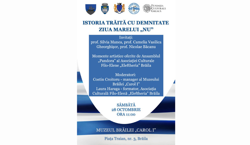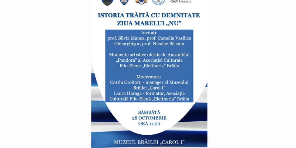 Ziua Marelui NU - a doua Sărbătoare Națională a Greciei - va fi sărbătorită astăzi, 28 octombrie 2023, ora 11.00, la sediul Muzeului Brăilei „Carol I”, din Piața Traian nr. 3. Organizator al evenimentului este Asociația Culturală Filo-Etenă „Eleftheria” Brăila, în parteneriat cu Consiliul Județean Brăila, Primăria Municipiului Brăila, Muzeul Brăilei „Carol I” și Fundația Culturală Greacă.