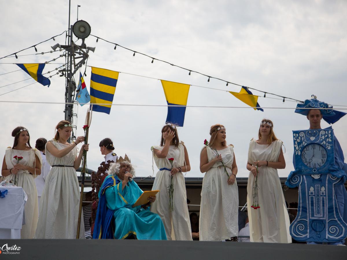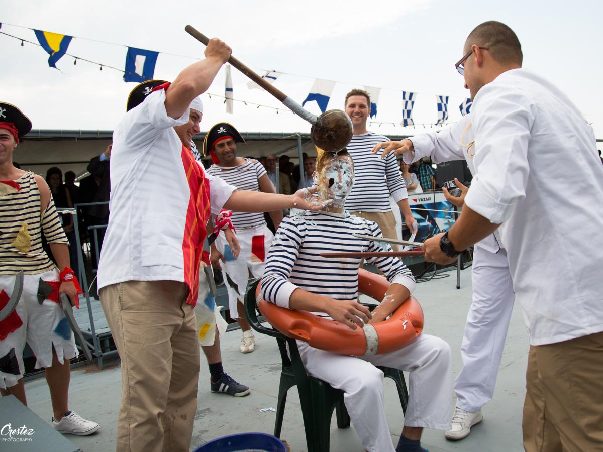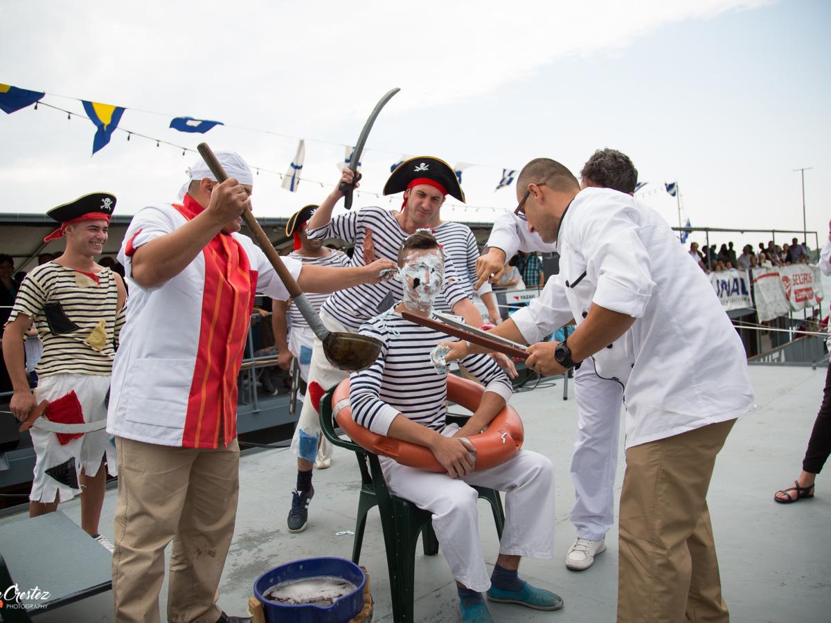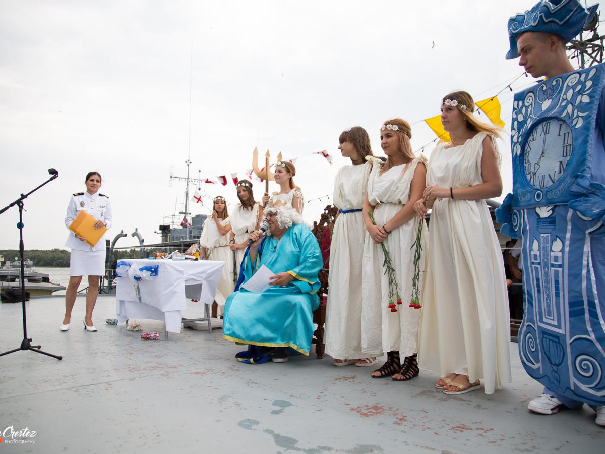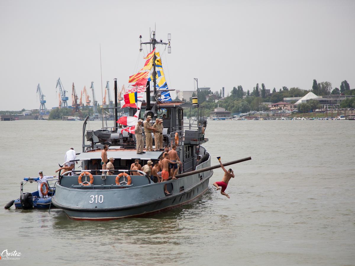 Înainte de începerea concursurilor, aşa cum este obiceiul, un tânăr “ghiborţ” înrolat recent în Flotila Fluvială, a primit botezul apei, sub supravegherea lui Neptun. Tânărul marinar a trecut şi el prin acelaşi ritual ca şi colegii săi din anii anteriori: a fost săpunit bine, “bărbierit” cu un ditamai briciul din lemn, apoi udat din cap până în picioare, ca să ştie că de-acum apa o să fie viaţa lui.