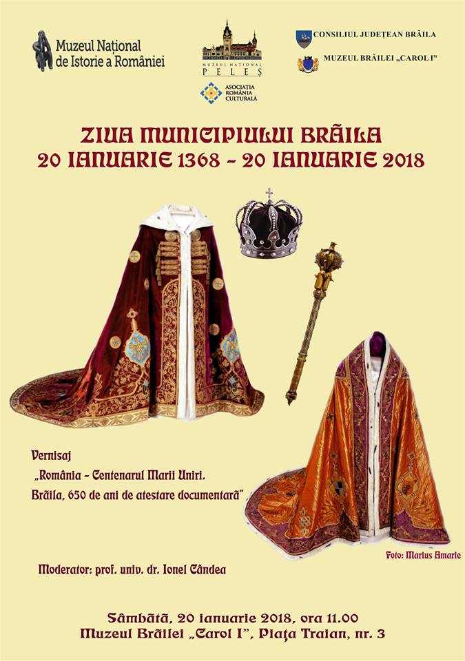Sâmbătă, 20 ianuarie 2018, ora 11.00, la sediul Muzeului Brăilei „Carol I” din Piața Traian nr. 3 va avea loc vernisajul expozițiilor „România - Centenarul Marii Uniri. Brăila, 650 de ani de atestare documentară” și „Regina Maria - Regina soldat”.