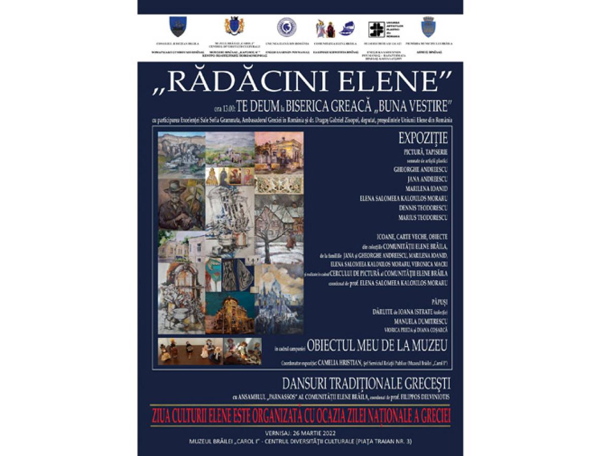 Concomitent, sub genericul "Rădăcini Elene", va avea loc vernisajul unei expoziții, la Centrul Diversității Culturale din cadrul Muzeului Brăilei "Carol I" (Piața Traian nr. 3). Vor fi expuse lucrări de pictură și tapiserie semnate de artiștii plastici Gheorghe Andreescu, Jana Andreescu, Marilena Ioanid, Elena Salomeea Kaloxilos Moraru, Dennis Teodorescu și Marius Teodorescu. Vor fi expuse, de asemenea, icoane, carte veche și obiecte din colecțiile Comunității Elene Brăila, de la familiile Jana și Gheorghe Andreescu, Marilena Ioanid, Elena Salomeea Kaloxilos Moraru, Veronica Macri, realizate în cadrul Cercului de Pictură al Comunității Elene Brăila, coordonat de prof. Elena Salomeea Kaloxilos Moraru.