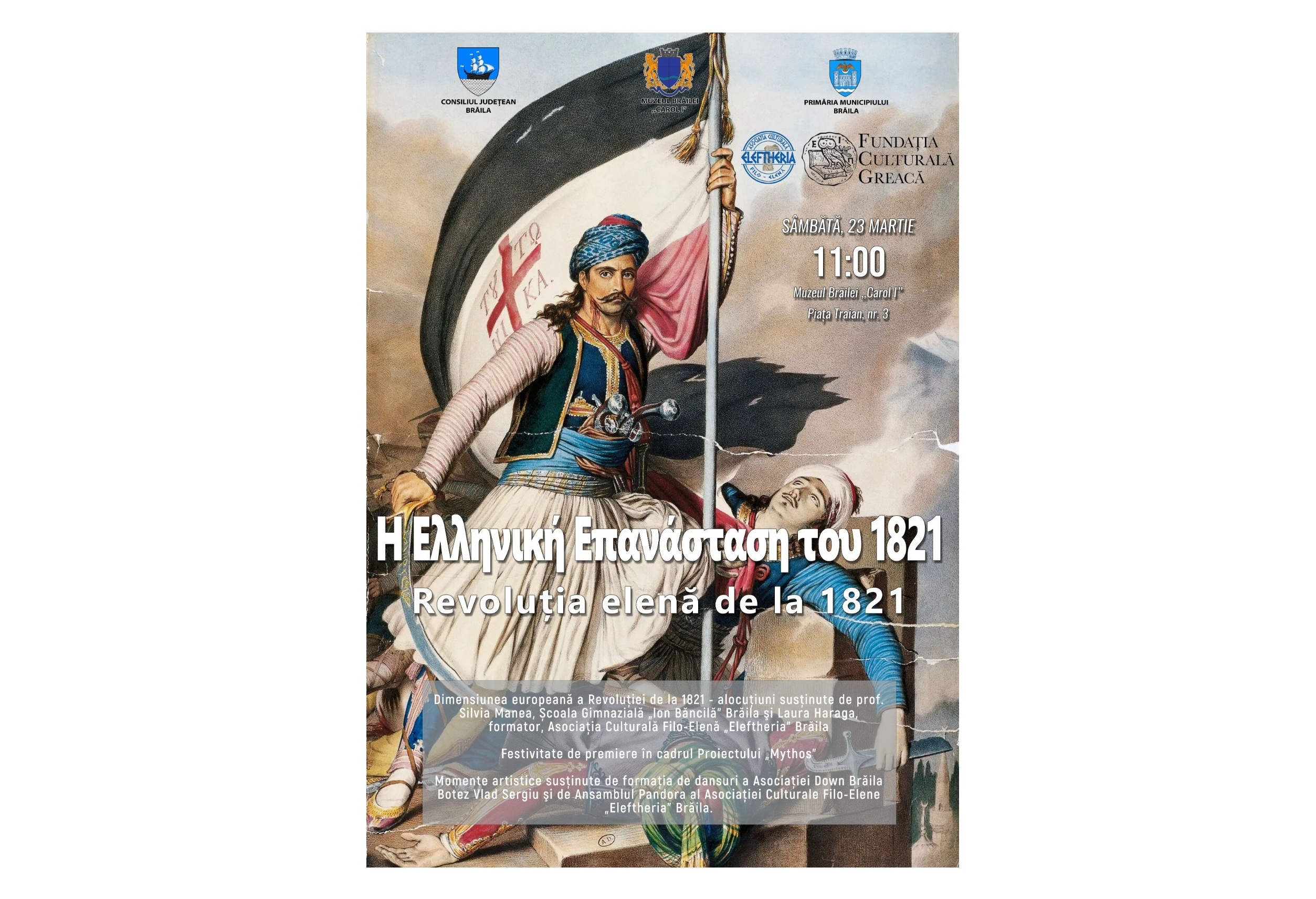 Brăilenii de toate vârstele sunt invitați sâmbătă, 23 martie, ora 11.00, la sediul central al Muzeului Brăilei „Carol I”, din Piața Traian nr. 3, pentru a participa la evenimentul prilejuit de împlinirea a 203 ani de la declanșarea Revoluției Elene de la 1821, un prim pas pentru obținerea independenței de stat a Greciei.