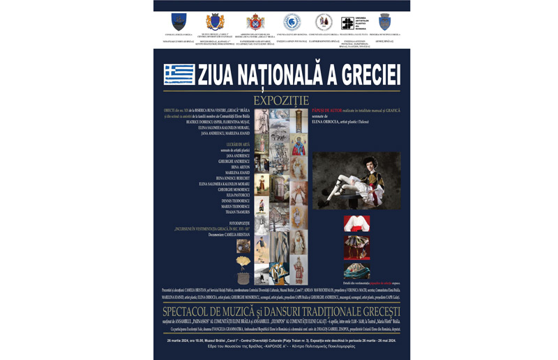 Marți, 26 martie, ora 18.00, la Centrul Diversității Culturale, din cadrul Muzeului Brăilei „Carol I” (Piața Traian nr. 3), are loc Vernisajul expoziției prilejuite de sărbătorirea Zilei Naționale a Greciei. Expoziția va fi deschisă publicului în perioada 26 martie - 26 mai a.c.