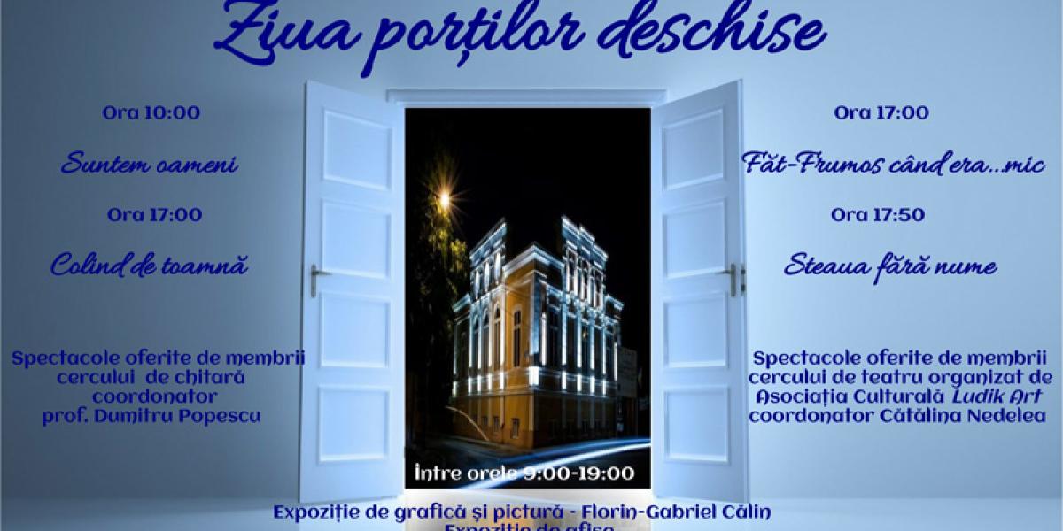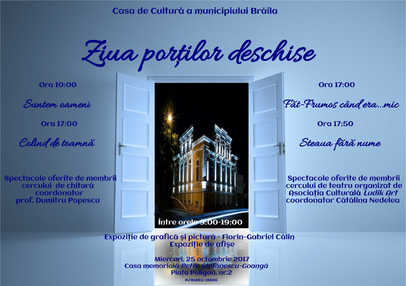 Miercuri, 25 octombrie, la Casa de Cultură a Municipiului Brăila din Piaţa Poligon nr. 2 are loc Ziua Porţilor Deschise, o acţiune care include o serie de evenimente a căror menire este de a face cunoscută activitatea instituţiei.