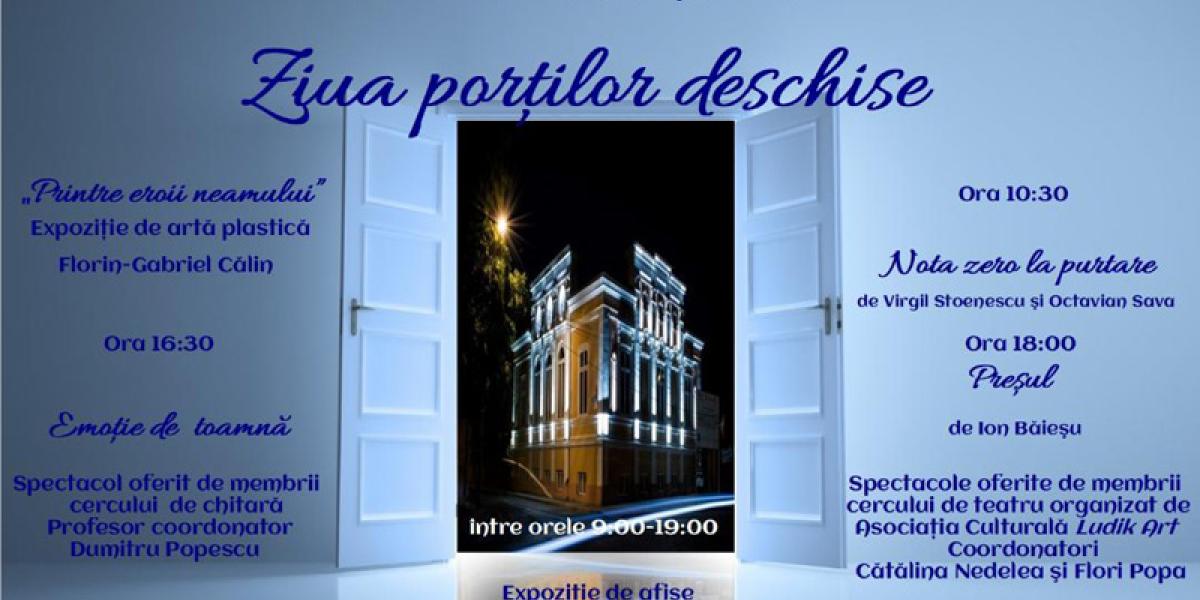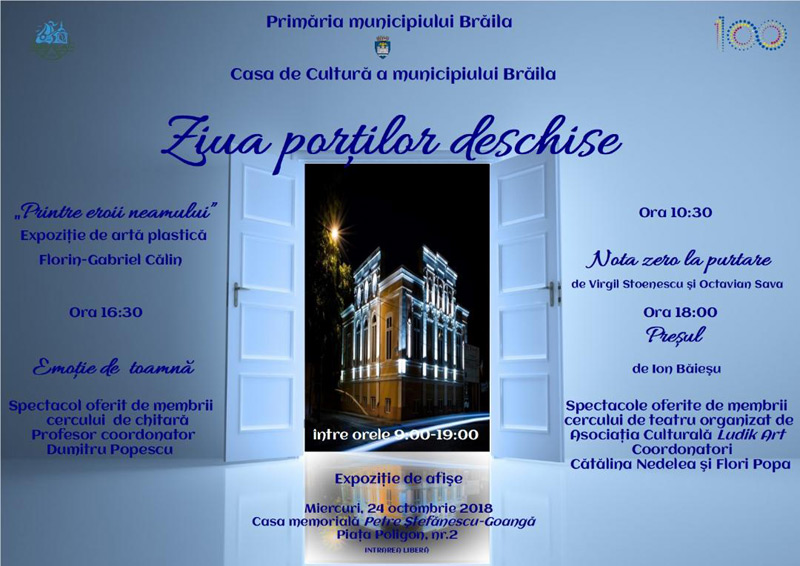 Casa de Cultură a Municipiului Brăila organizează miercuri, 24 octombrie 2018, Ziua Porţilor Deschise, la sediul său din Piaţa Poligon nr. 2. Acţiunea include o serie de evenimente a căror menire este de a face cunoscută activitatea instituţiei, programul zilei fiind următorul: