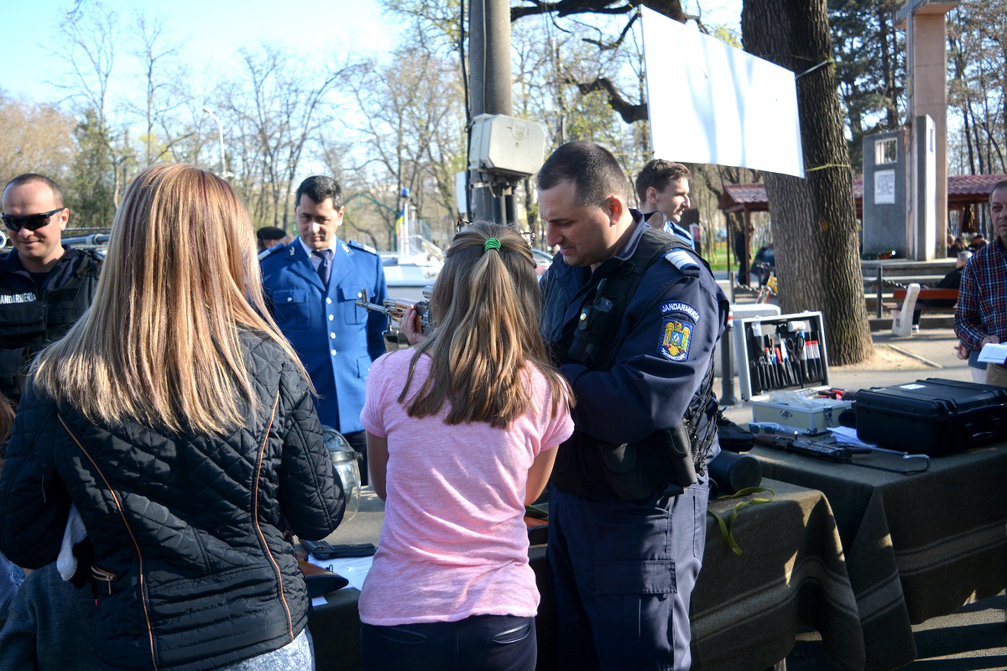 La finalul săptămânii trecute, pe 01 şi 02 aprilie, în intervalul orar 15.00-19.00, un stand de prezentare a Jandarmeriei a fost amplasat în rondoul Parcului Monument. Tinerii au venit, grupuri, grupuri, pentru a admira dotarea jandarmilor, fiind prezentate materialele şi tehnica folosite în misiunile instituţiei. Elevilor de liceu care doresc să opteze pentru o carieră militară le-a stat la dispoziţie un specialist din cadrul Biroului Resurse Umane.